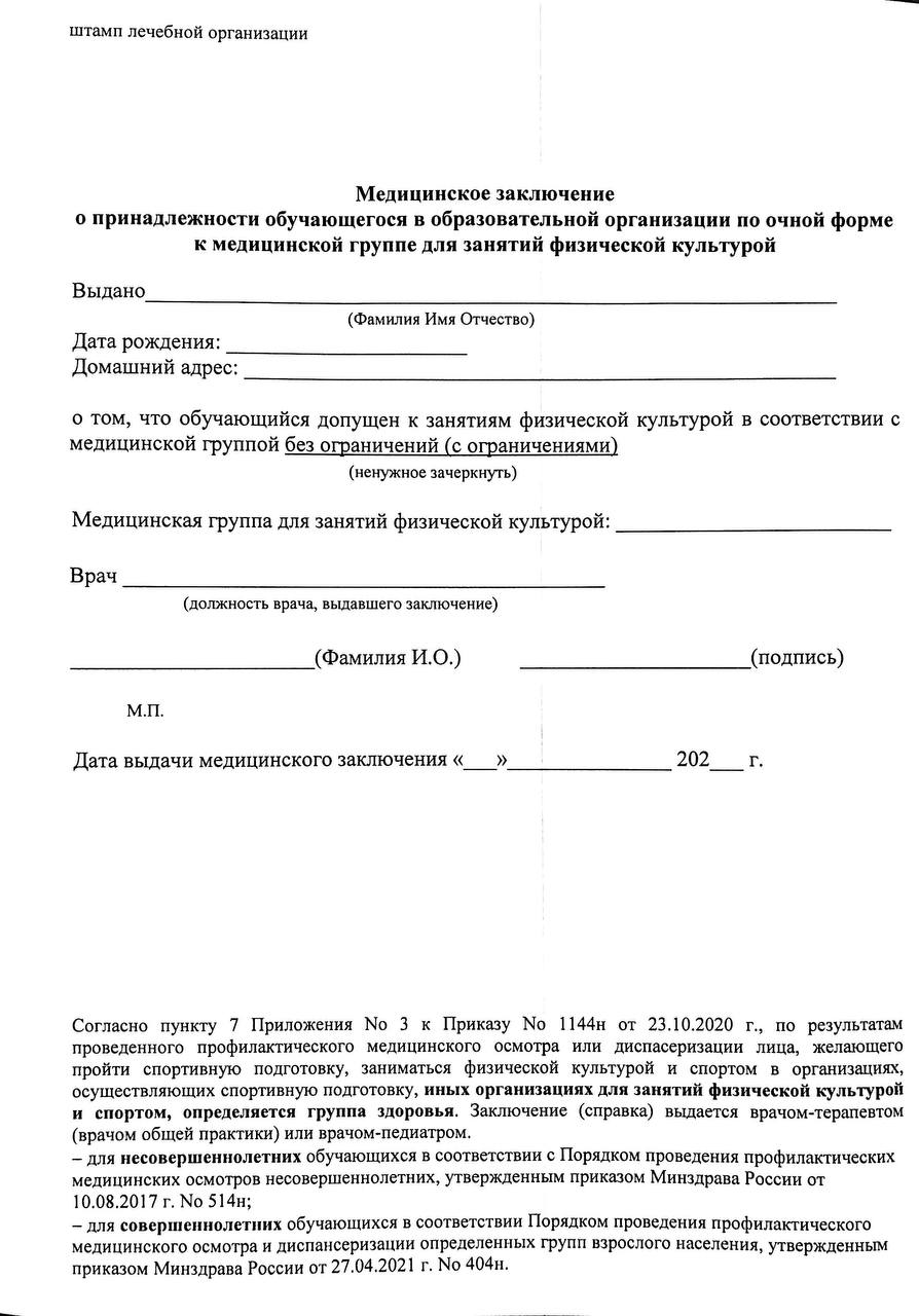 Форма справки утверждена Министерством здравоохранения. При этом повторно проходить медицинский осмотр не требуется. Основанием для допуска лица к выполнению нормативов испытаний (тестов) комплекса ГТО является наличие у него медицинского заключения с установленной первой или второй группой здоровья, выданного по результатам профилактического медицинского осмотра или диспансеризации согласно возрастной группе в соответствии с приказами Минздрава России пройденный в школе в течение учебного года.