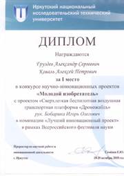3) Члены команды УИЛ Коваль А.П. и Груздев А.С. заняли 1-е место в конкурсе научно-инновационных проектов «Молодой изобретатель» с проектом «Сверхлёгкая беспилотная воздушная транспортная платформа «Дроножабль» в номинации «Лучший инновационный проект» в рамках Всероссийского фестиваля науки, который проходил с 18 по 20 октября, 2018года