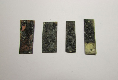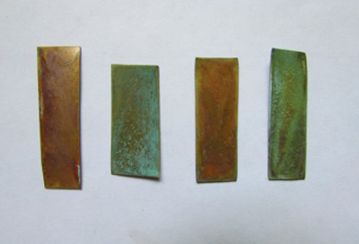 «В экспериментальной части при исследовании патинирования были использованы пластины различных металлов и сплавов - медь, бронза, латунь, мельхиор, серебро и т.д. Я воздействовала на них перенасыщенным раствором азотной кислоты медью или железом в различных концентрациях и в смешанном виде. Также патинирование было проведено в парах аммиака, в растворе медного купороса, нашатырного спирта, в водном растворе медного купороса и перманганата калия, растворе поваренной соли и нашатырного спирта и др. Отдельное внимание я уделила сере и серной кислоте, поскольку это наиболее часто встречающиеся компоненты патинирующих растворов и смесей.