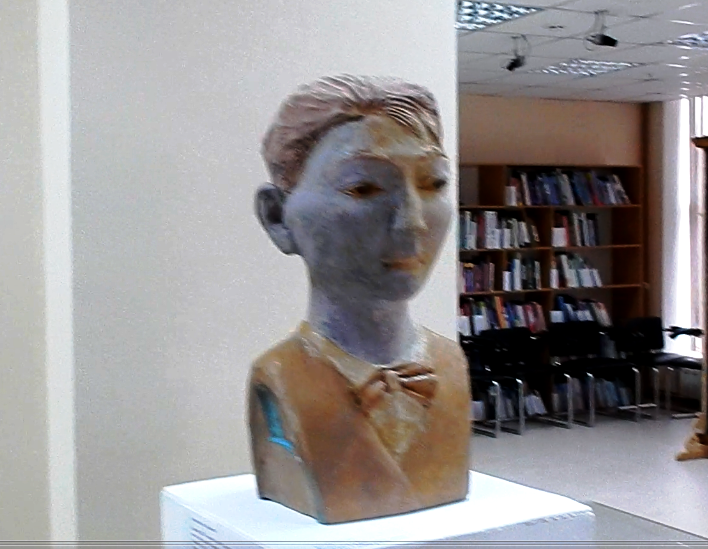 на четыре сегмента. В нижней части блюда изображены две «земные лошади», а вверху мастер нарисовала «небесных коней» - героев бурятской мифологии. Если внимательно вглядываться в изделие, то можно заметить, как животные скачут друг за другом, визуально превращая тарелку в подобие буддийского «колеса сансары». Заслуживает внимания еще одна работа Ольги Копенкиной - «Портрет в чароитовых тонах». Она представляет собой объемную глиняную скульптуру, выполненную с натуры в технике бескаркасной лепки. Прототипом портрета стала одна из студенток ИРНИТУ. Половина лица героини окрашена в сиреневый цвет, словно отсылая к названию «Портрет в чароитовых тонах». Таким способом автор напомнила о самоцвете, единственным месторождением которого является север Сибири. По словам Ольги Копенкиной, в этом изваянии ей удалось подчеркнуть не только индивидуальные черты девушки, например, резко очерченные скулы, но и особую выправку, характерную для восточных народов.