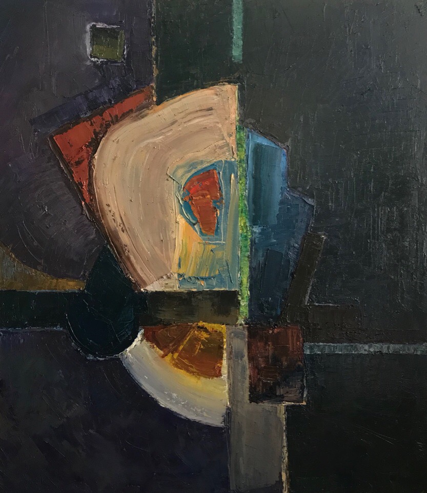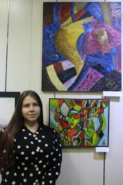 Любовь Чеботарева подготовила для выставки работы «Синий контраст» и «Зеленый контраст». В геометрических фигурах прослеживается цветовой круг «красный - зеленый, синий - оранжевый, фиолетовый – желтый». Как пояснила студентка, ее картины не обладают какой-либо символикой, а лишь служат способом найти удачное соотношение цветов и пропорций.