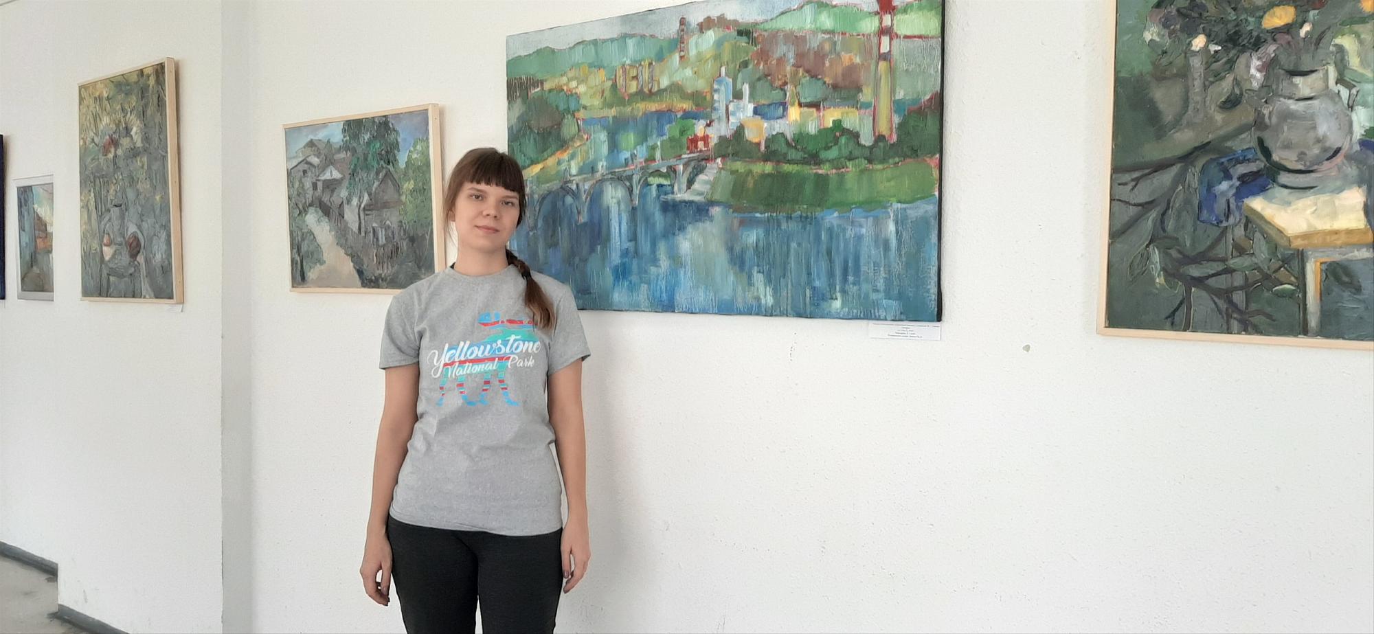 Посетителей выставки привлекло внимание творчество Любови Чеботаревой. В центре пейзажа – Глазковский мост. Студентка сумела гармонично соединить образы динамичного города, сочной летней зелени деревьев и тихой глади реки.