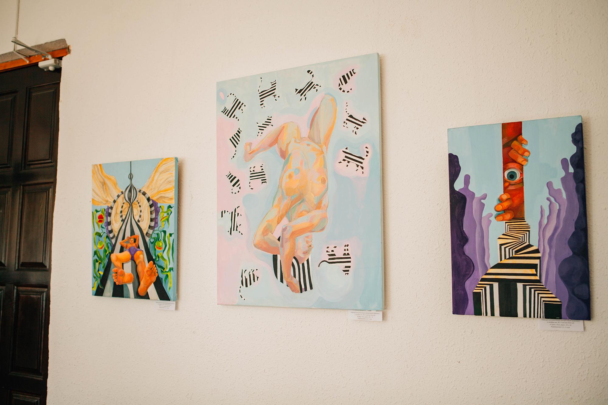 преподавателей кафедры Натальи Довнич и Марии Быковой. В отдельный блок вошли оригинальные акриловые произведения дипломницы Анастасии Карамышевой. Каждый проект соединяет в себе талант, авторский подход и знания, полученные студентами в процессе изучения теории цвета, композиции, проектирования и других дисциплин.