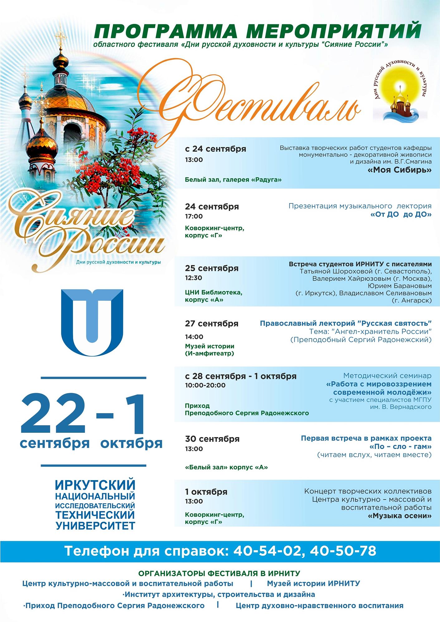 По словам проректора по молодежной политике и работе с выпускниками Сергея Аносова, ИРНИТУ в течение 25 лет активно участвует в фестивале. Он выразил признательность сотрудникам Центра культурно-массовой и воспитательной работы, Музея истории, Центра духовно-нравственного воспитания за вклад в организацию и проведение мероприятий «Сияния России». Благодаря им в университете в дни фестиваля проходят концерты творческих коллективов вуза, встречи с писателями и деятелями искусства.
