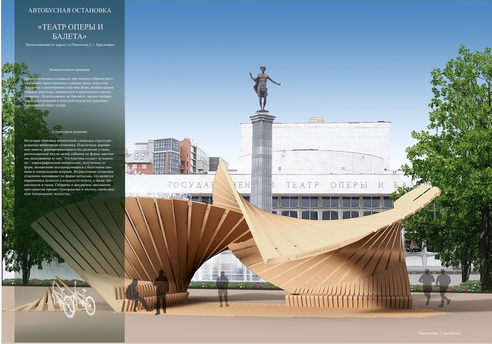 Кроме того, жюри высоко оценило мастерство Анны Святцевой из Красноярска, выигравшей в номинации «Остановка общественного транспорта». Этот инфраструктурный объект, по мнению автора, можно стилизовать под органный зал. К музыкальной тематике и величественному образу инструмента отсылает множество вертикалей в модели. Построить остановку-орган студентка предлагает из прозрачного стекла, обрамленного металлическим корпусом с красными пластиковыми вставками.
