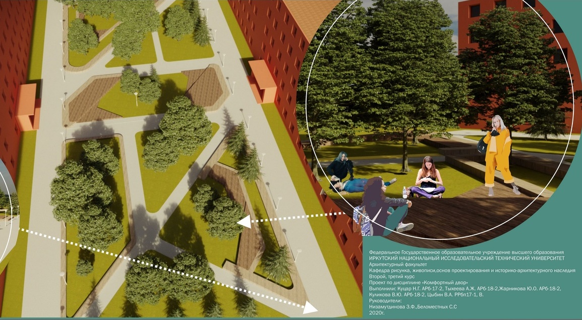 Первое место в направлении «Комфортный двор» заняли третьекурсница кафедры архитектурного проектирования Ольга Фомина и будущий реставратор Павел Пуляевский. Под руководством Зили Низамутдиновой они работали над проектом по благоустройству территории между общежитиями №7 и №4 вблизи улицы Игошина. Этот участок представляет собой заросший пустырь.