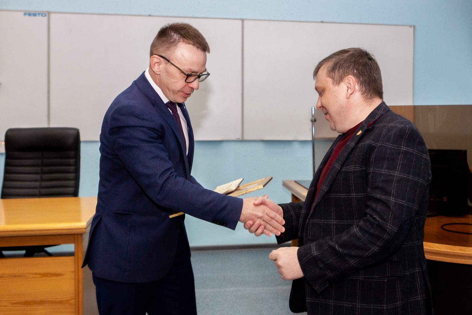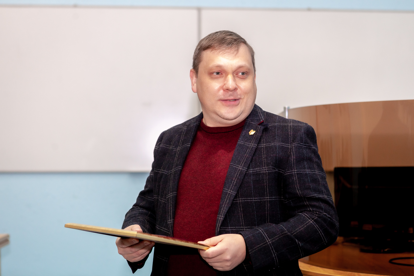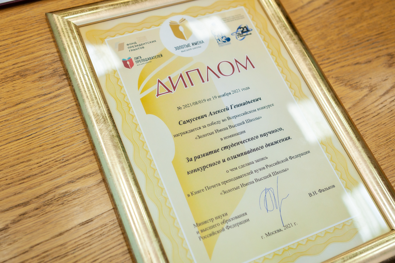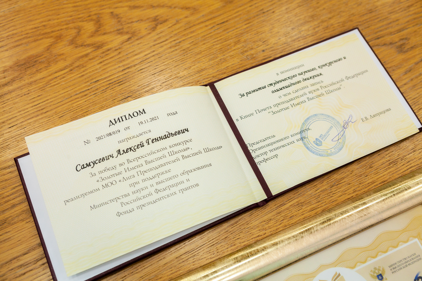 Вручение наград за подписью министра науки и высшего образования Валерия Фалькова, главы координационного совета «Лиги Преподавателей Высшей Школы» Елены Ляпунцовой состоялось на ректорском совещании 29 ноября. Коллегу поздравил проректор по научной работе Владимир Смирнов.