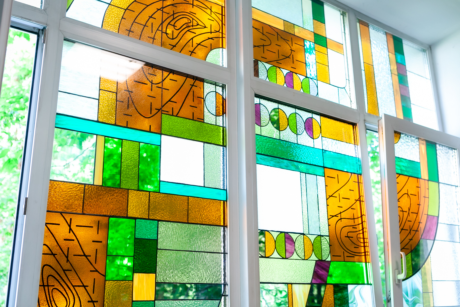 Дипломница Наталья Таюрская выполнила витраж в технике Тиффани с использованием в каркасе латунных профилей для прочности стеклянного полотна. Кроме того, она расширила художественные возможности витража росписью по стеклу.