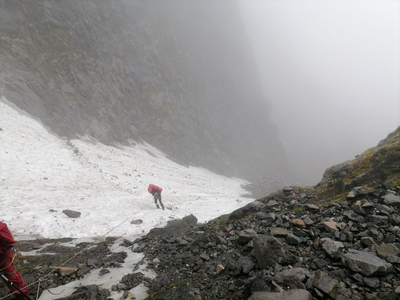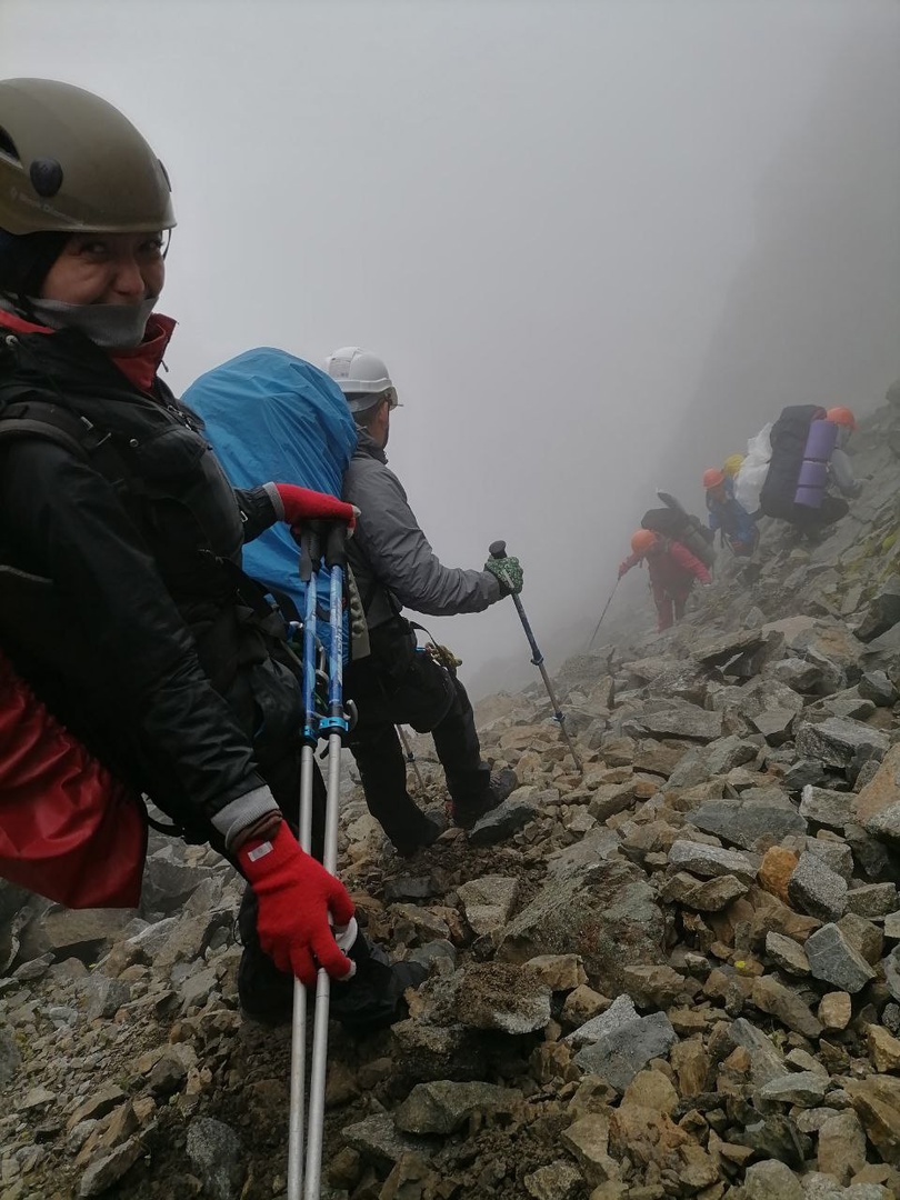 Далее по маршруту значились перевалы Динозавр и Людмила, спуск с которого был весьма напряженным: густой туман, вероятность камнепада. На одном заснеженном участке использовали веревку.