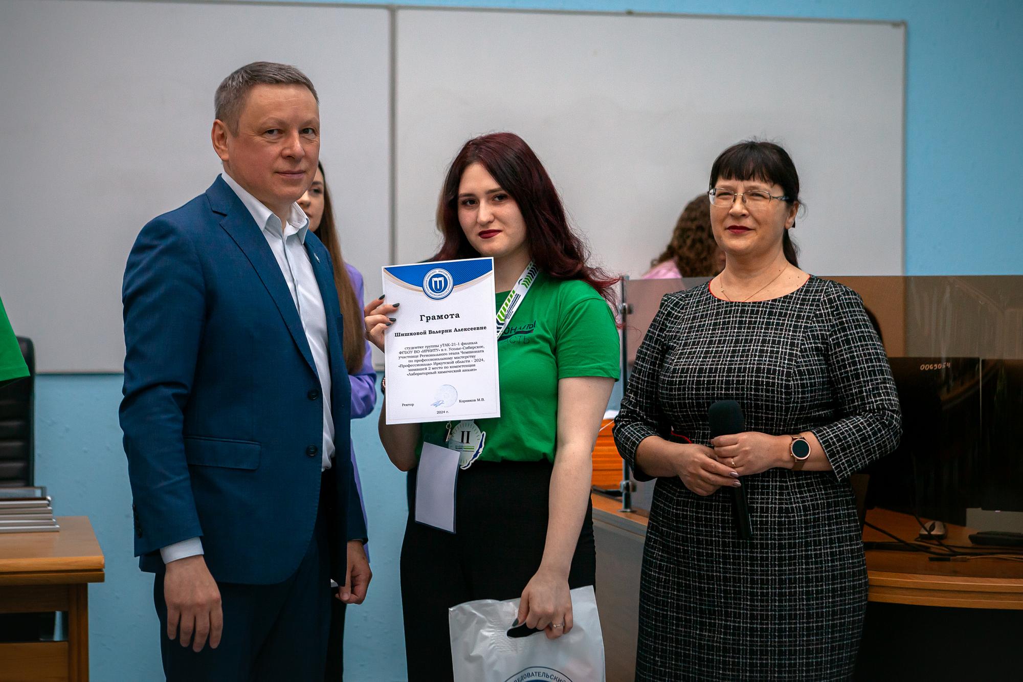 Студентка Филиала ИРНИТУ в г. Усолье-Сибирское Валерия Шишкова стала второй в компетенции «Лабораторный химический анализ». Станислав Васёв из Машиностроительного колледжа занял второе место в номинации «Графический дизайн». Илью Климентьева и Георгия Теленькова из Геологоразведочного техникума наградили грамотой за второе место по направлению «Геопространственные технологии».