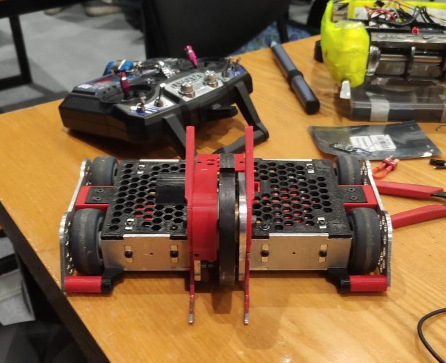 Политеховским роботами дистанционно управлял Максим Попов. К боям он подготовил две машины. Это экспериментальный Tiny с двумя большими оцинкованными колёсами и Babr monster mini с устрашающими красными «ушками».