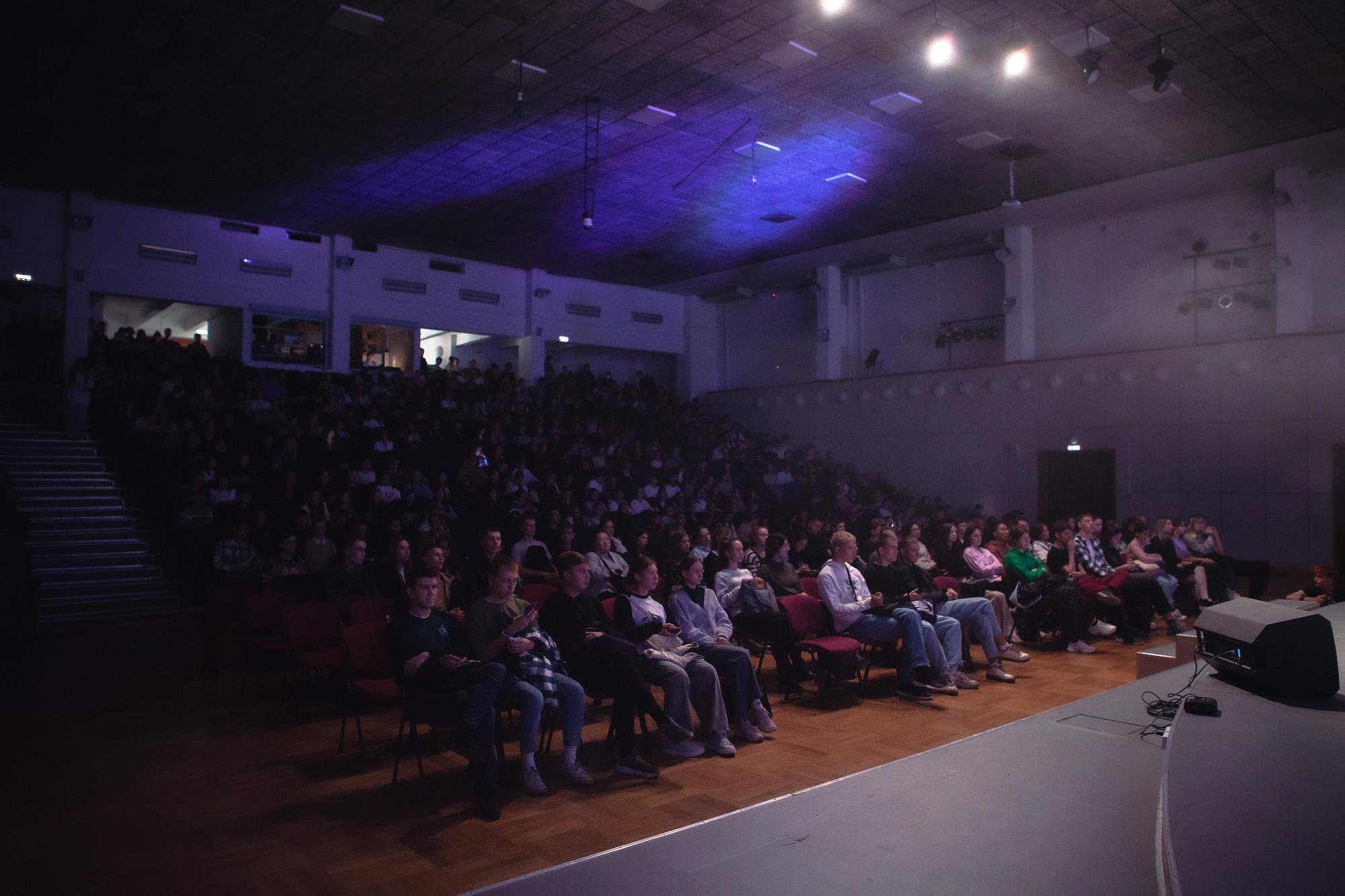 В актовом зале новичков политеха приветствовали ведущие, студенты Института энергетики Данила Зайцев и Виктор Филатов – актер народного театра «Предместье». Как сообщил молодой человек, это коллектив с полувековой историей, воспитавший 10 поколений артистов из студентов. «Предместье» (руководитель – Евгений Кириллов) славится аншлагами и победами на фестивалях, а также студией художественного слова. Результатом творческих исканий студентов и педагогов становятся литературно-поэтические композиции.