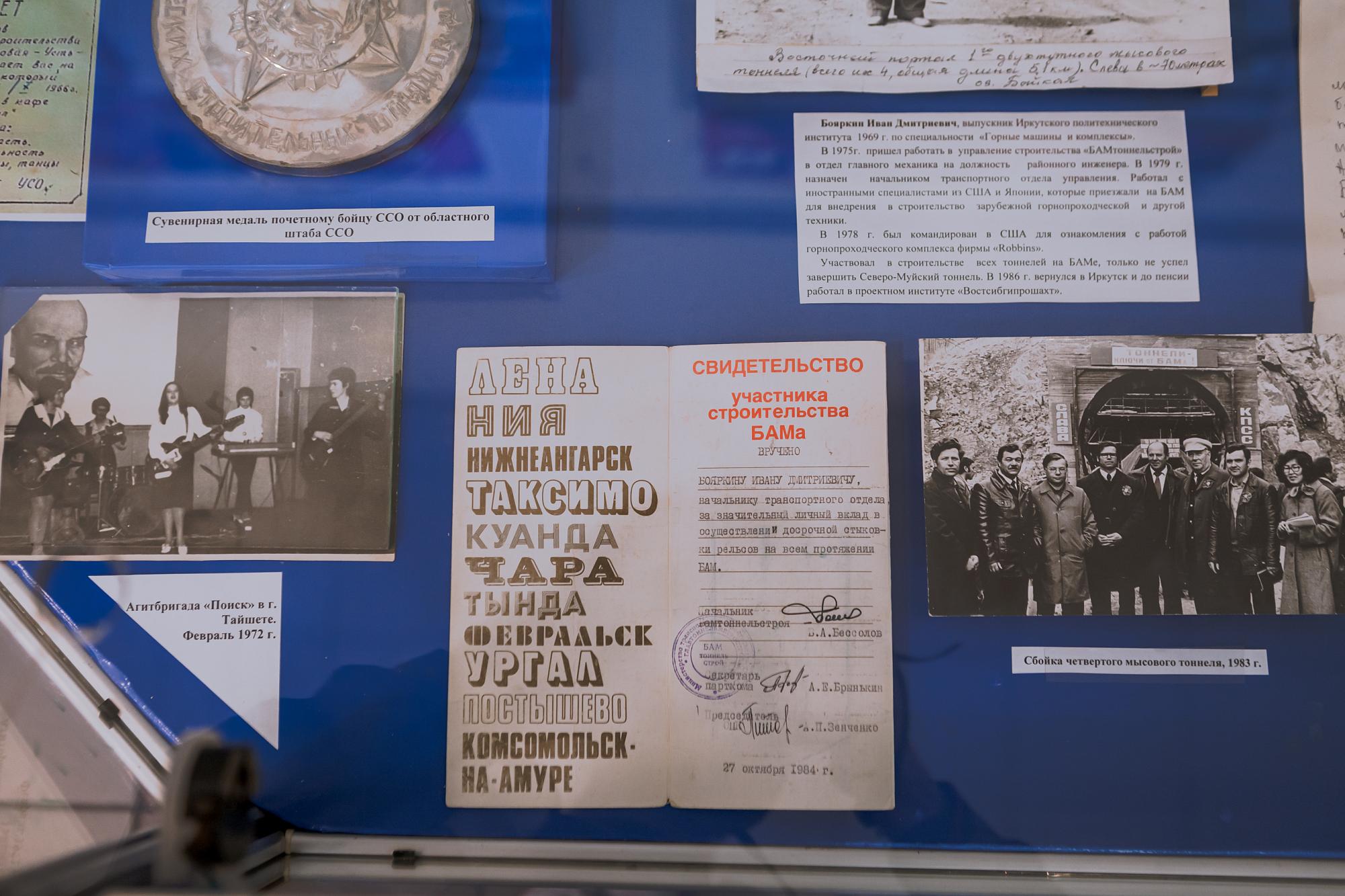 Главный хранитель экспонатов Музея истории Татьяна Могильницкая познакомила студентов с этапами возведения Байкало-Амурской магистрали в 1932-1974 гг. Позже БАМ объявили Всесоюзной комсомольской стройкой, появились тоннели. Масштаб инженерных работ был настолько велик, что в 1975 году создали спецуправление «Бамтоннельстрой». Около 11 лет в отделе главного механика трудился выпускник Иркутского политехнического института Иван Бояркин. Он выезжал за рубеж, чтобы изучить особенности работы горнопроходческой техники и применить опыт коллег на БАМе. В своих воспоминаниях Иван Дмитриевич отмечал сложные геологические и климатические условия, описывал технику и результаты коллективного труда.