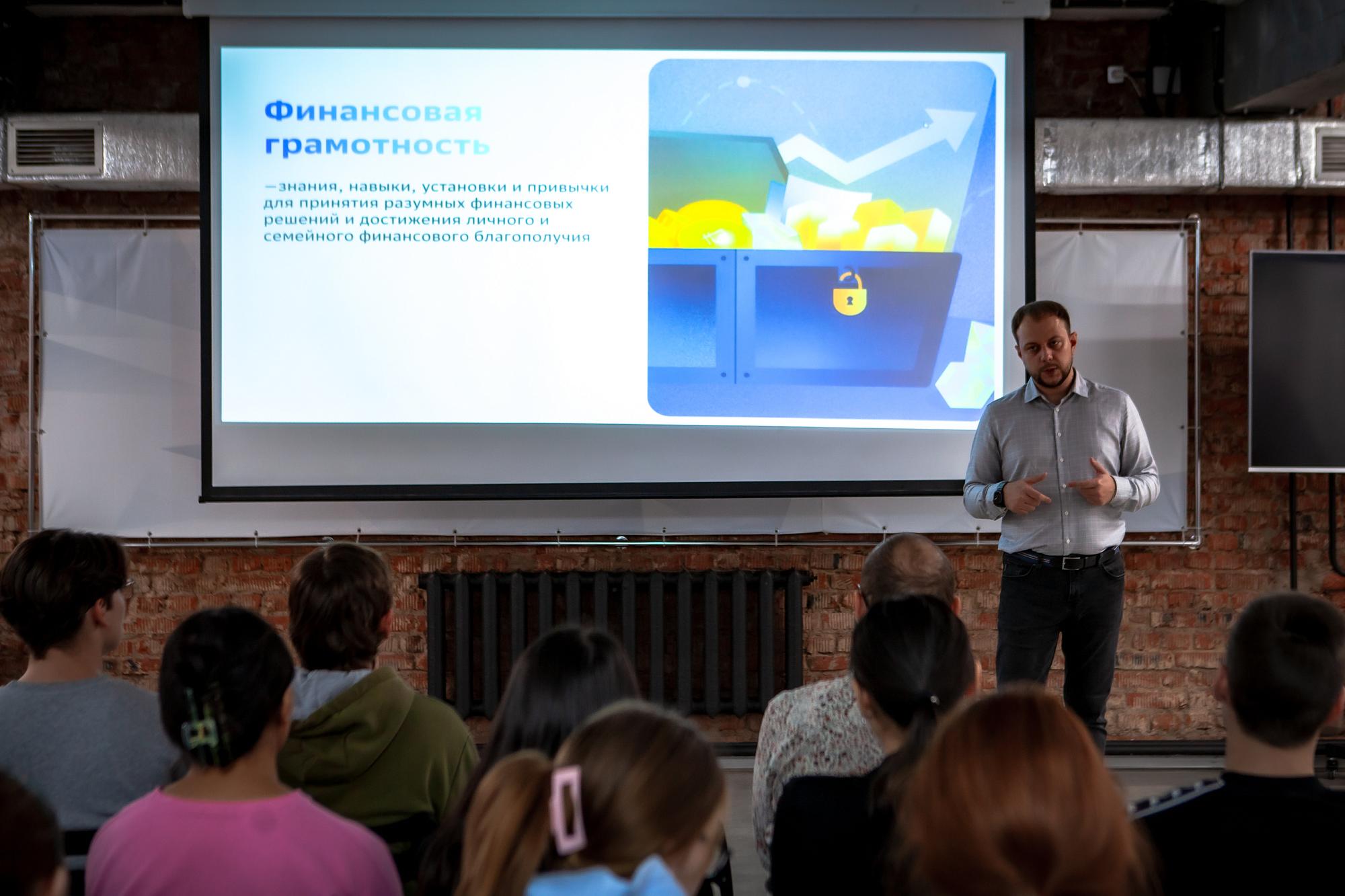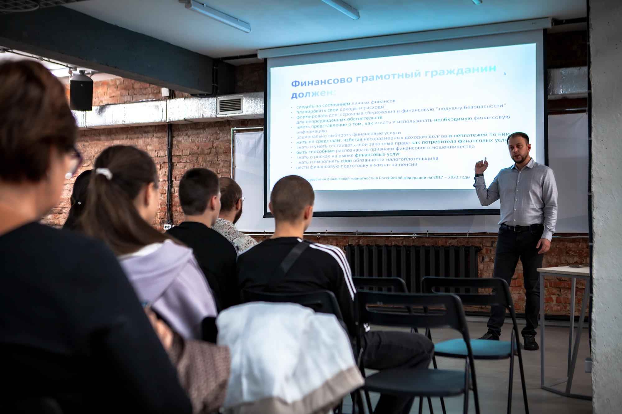 Спикер начал встречу со знакомства, рассказав политеховцам об опыте работы в банковской сфере и публичных выступлениях в БГУ и САФ ИГУ. Затем Сергей Лылов объяснил студентам, что такое финансовая грамотность. По словам лектора, это знания, навыки и привычки для принятия решений, способствующих личному и семейному благополучию.