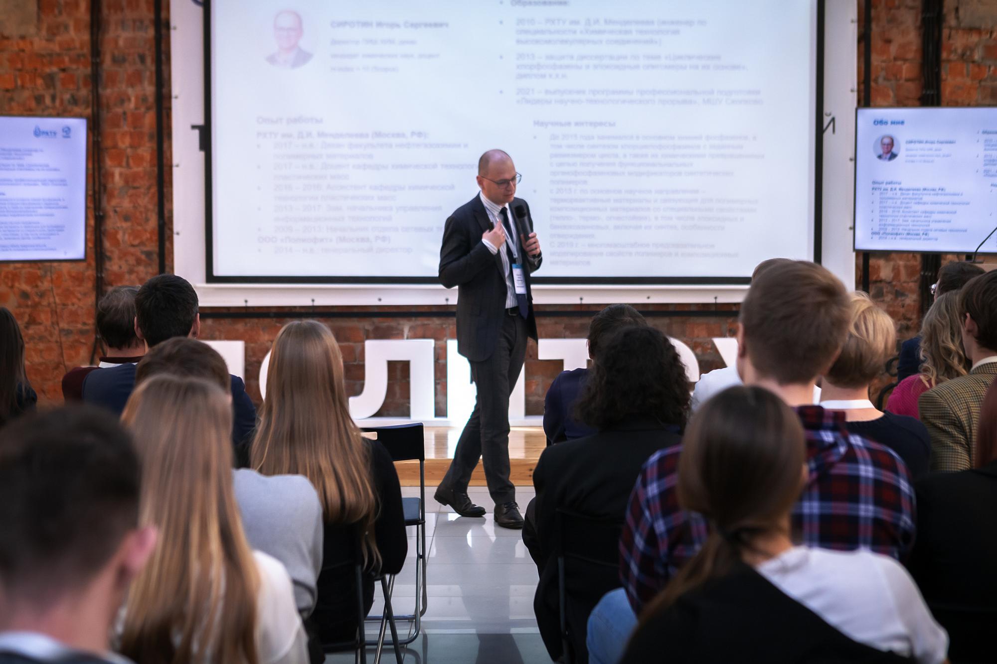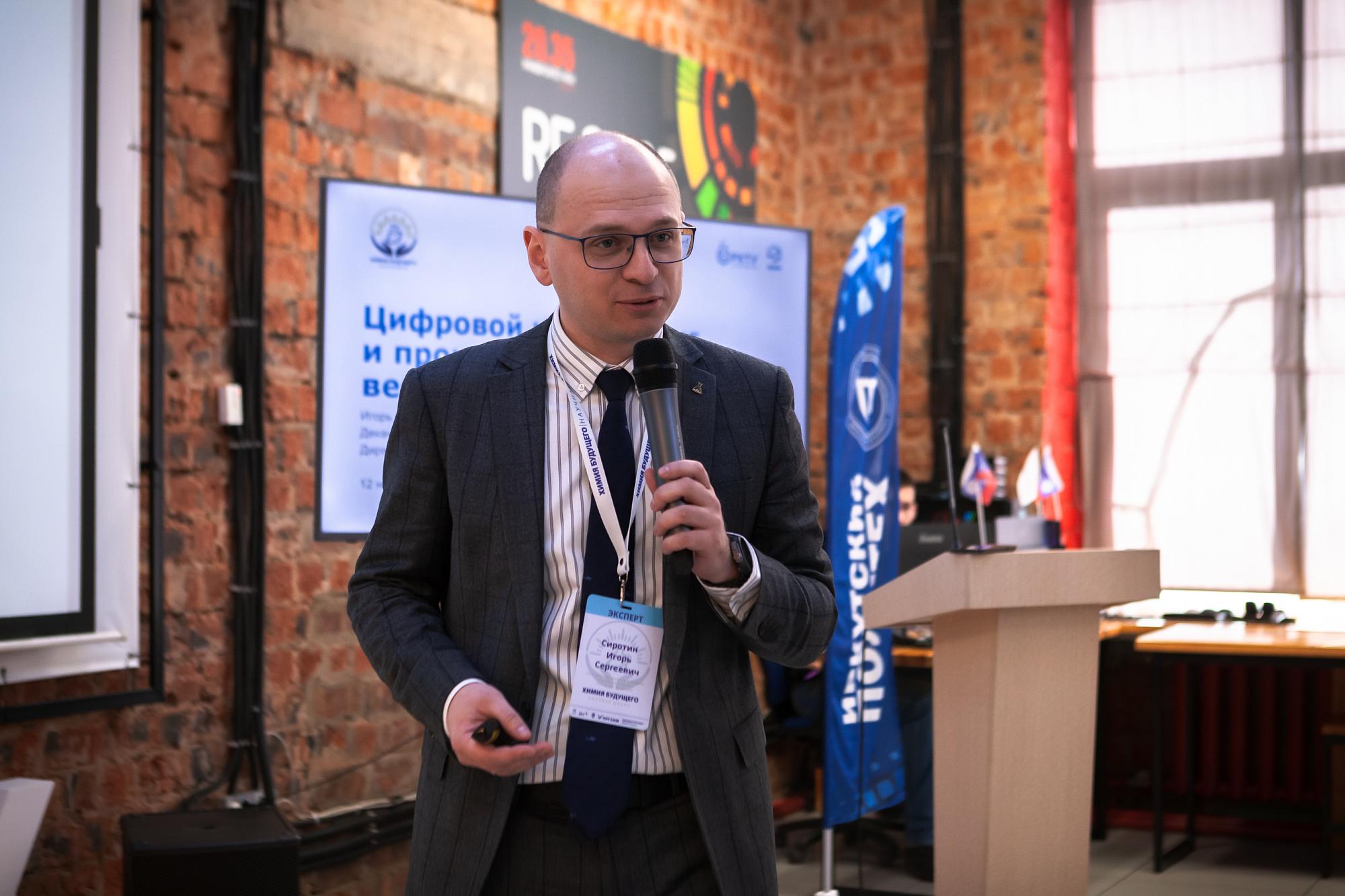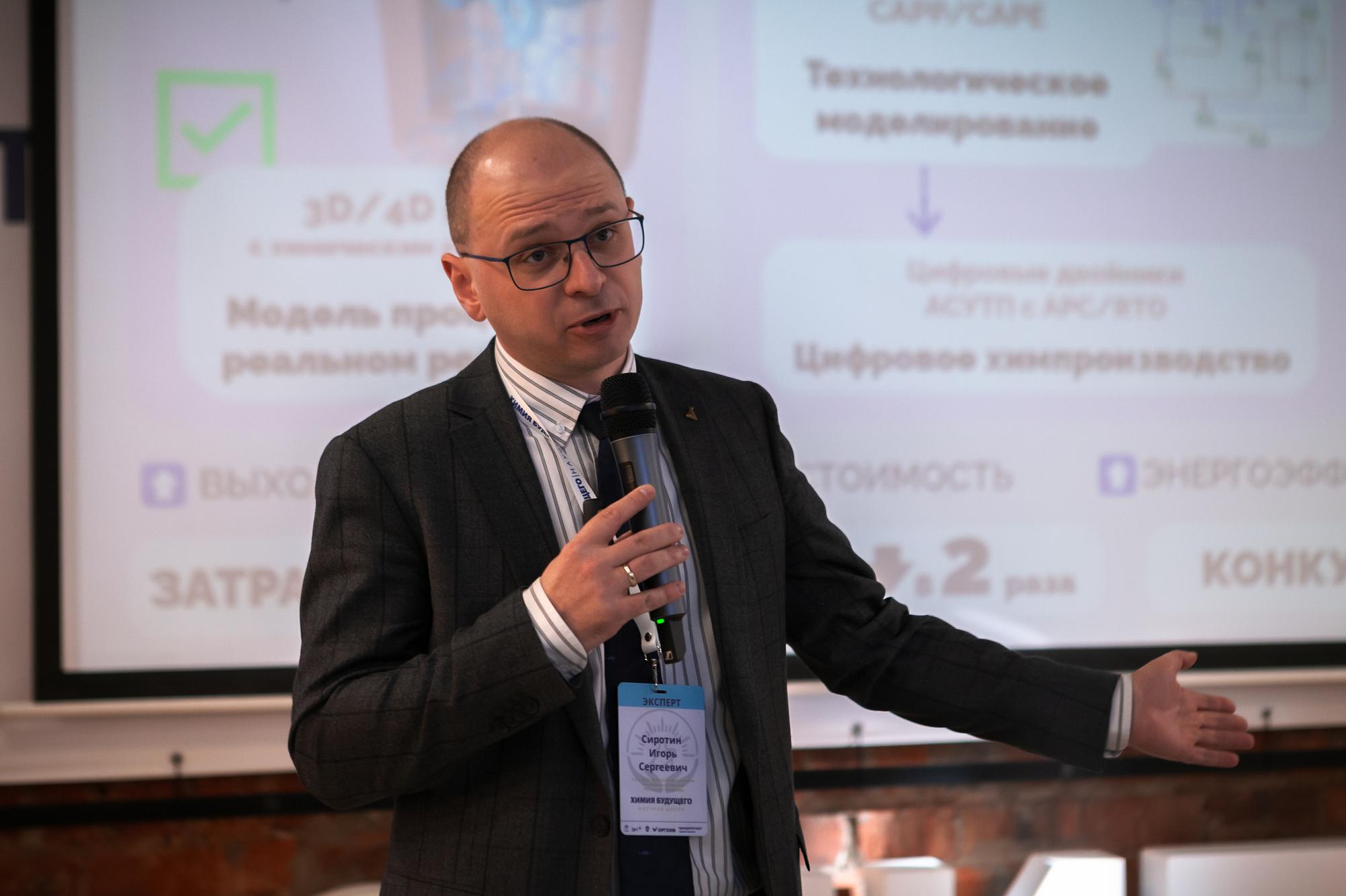 Декан факультета нефтегазохимии и полимерных материалов РХТУ им. Д.И. Менделеева Игорь Сиротин выступил с лекцией о цифровом инжиниринге и производстве. Он рассказал о жизненном цикле химических предприятий, моделировании технологических процессов, компаниях с большим ассортиментом продукции. Спикер представил свой опыт и наработки коллег в проектировании реакторов.