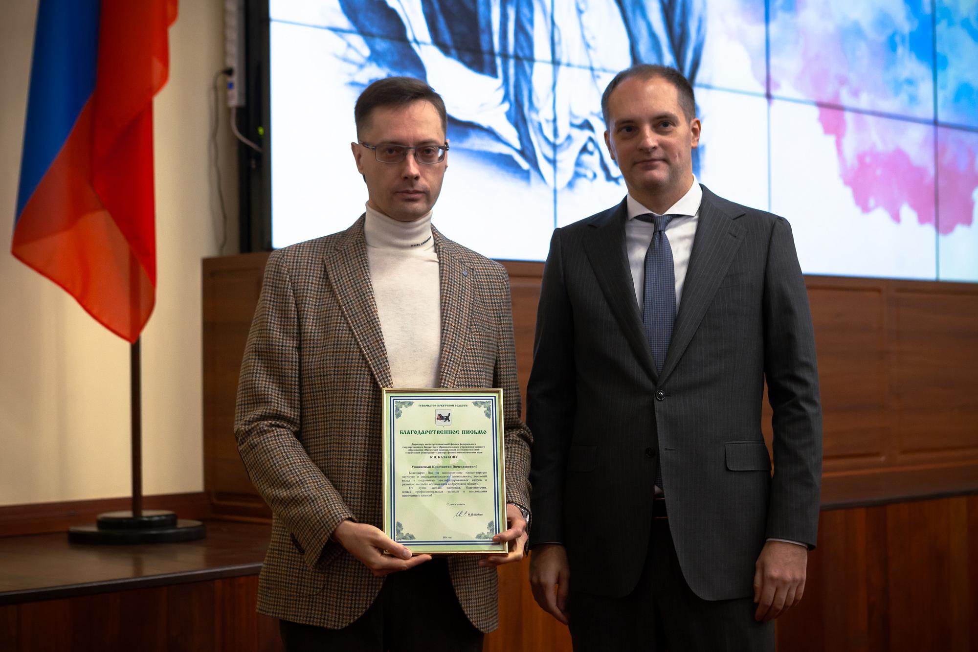 Почетные грамоты губернатора получили директор Института квантовой физики Константин Казаков, доценты кафедры монументально-декоративной живописи и дизайна им. В.Г. Смагина Андрей Шолохов и Марина Захарчук.