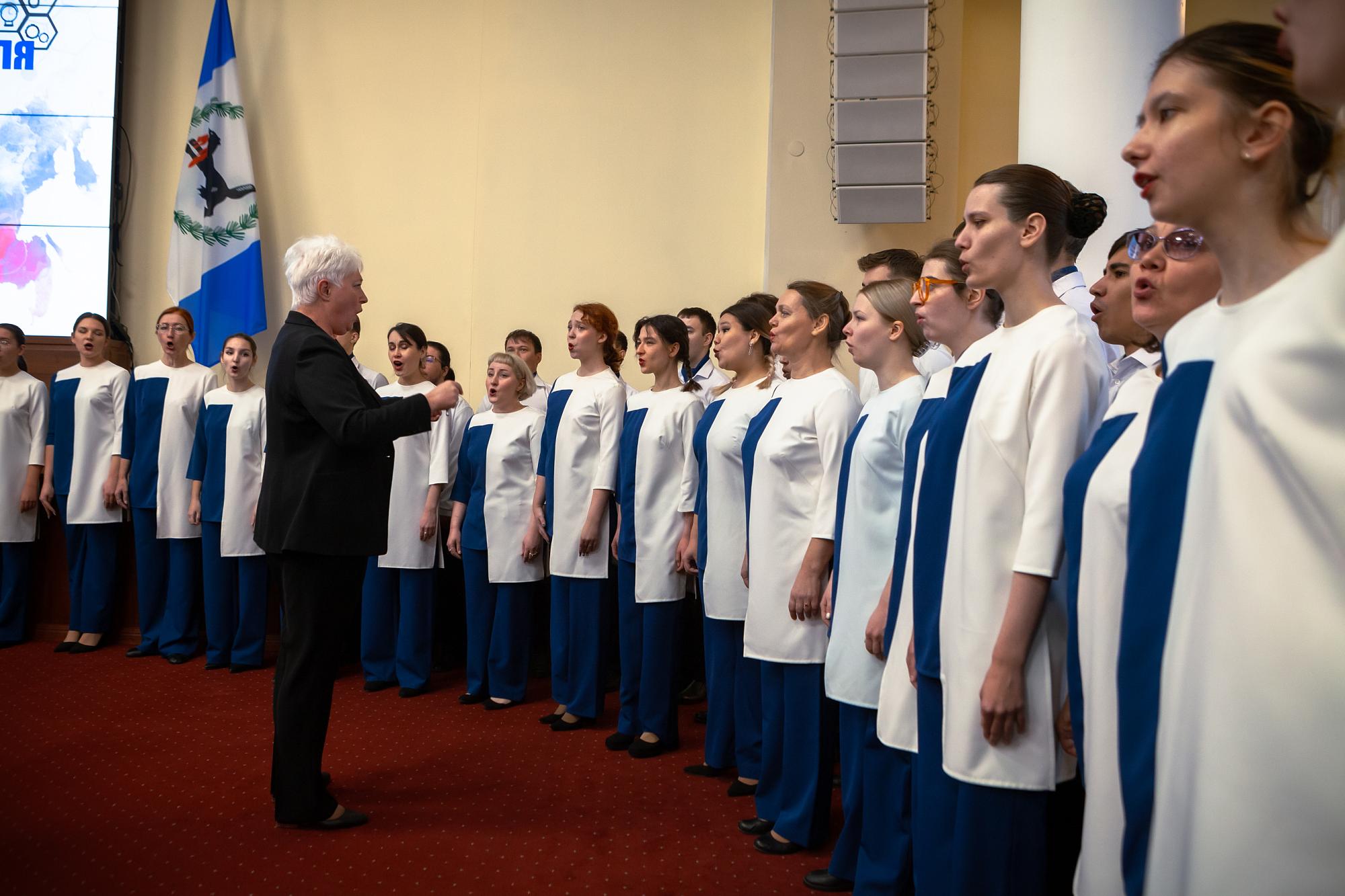 Гостям областного правительства показали видеоролик, подготовленный ребятами из вузов Приангарья. Студенческий гимн GAUDEAMUS прозвучал на латыни в исполнении хора Иркутского госуниверситета.