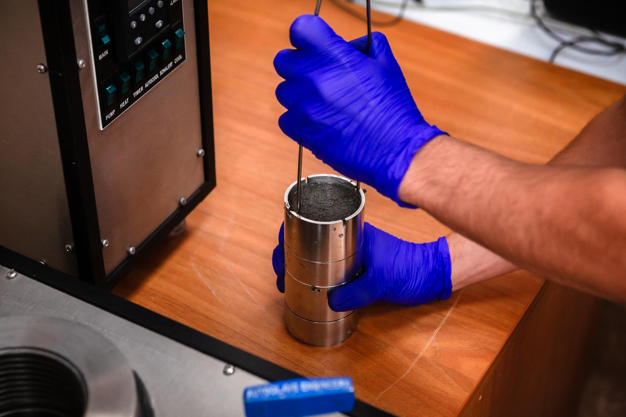 Коллектив при содействии Шелеховского завода металлоконструкций создал партию испытательных ячеек, состоящих из формы-конуса, фильтрующего узла, сборника фильтрата. Политеховцы заполняют цементным раствором и помещают ячейки в автоклав для поддержания термобарических условий. Жидкость переходит в твердое состояние, степень сцепления получившегося тампонажного камня со стенками ячеек участники проекта определяют выдавливанием при помощи гидравлического пресса.