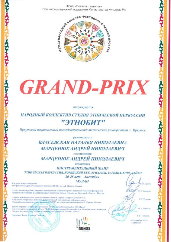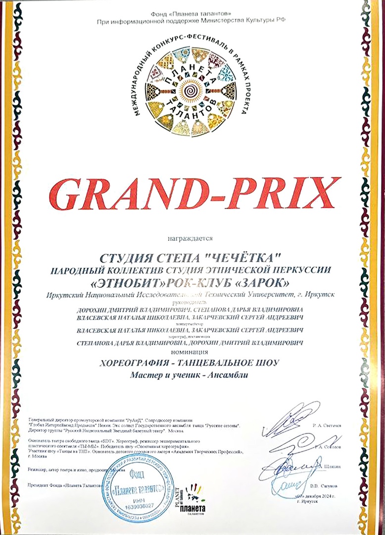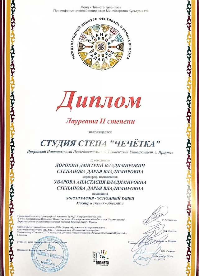 Коллективы Центра культурно-массовой и воспитательной работы ИРНИТУ 6-8 декабря успешно выступили на Международном конкурсе-фестивале «Сибирь зажигает звезды», который дважды в год организует Фонд «Планета талантов». Политеховцы завоевали три гран-при и получили дипломы лауреатов.