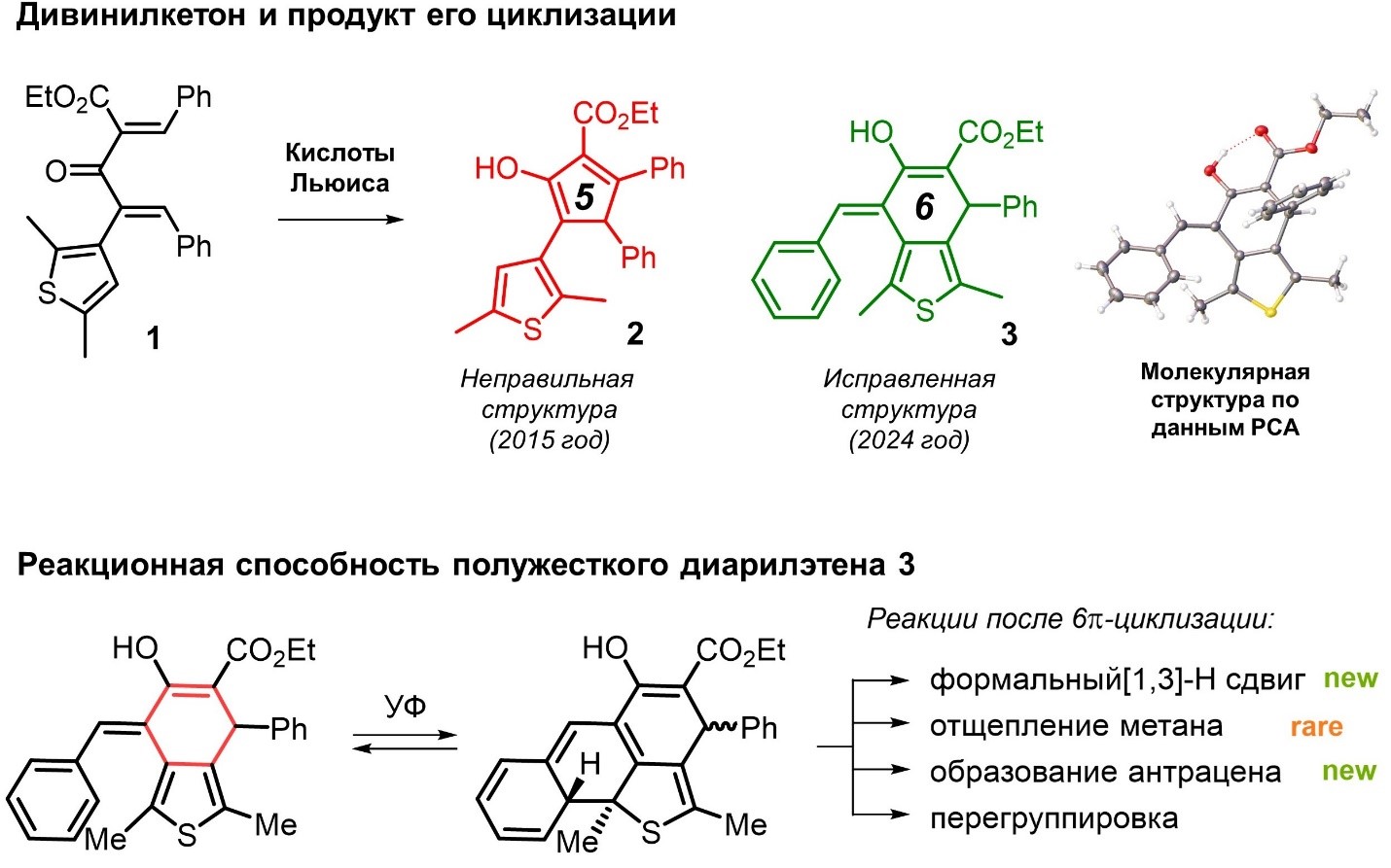 Можно сказать, что новая статья сотрудников лаборатории под руководством Андрея Львова следует принципу, сформулированному Геймом. Предметом исследования стала реакционная способность «полужестких» диарилэтенов в фотохимических превращениях. Основным объектом исследования стало химическое соединение со структурой 3, представленное на рисунке. По словам Андрея Геннадьевича, история этого соединения интересна и поучительна.