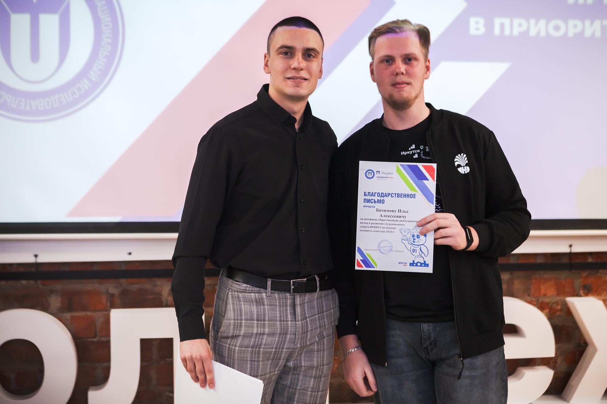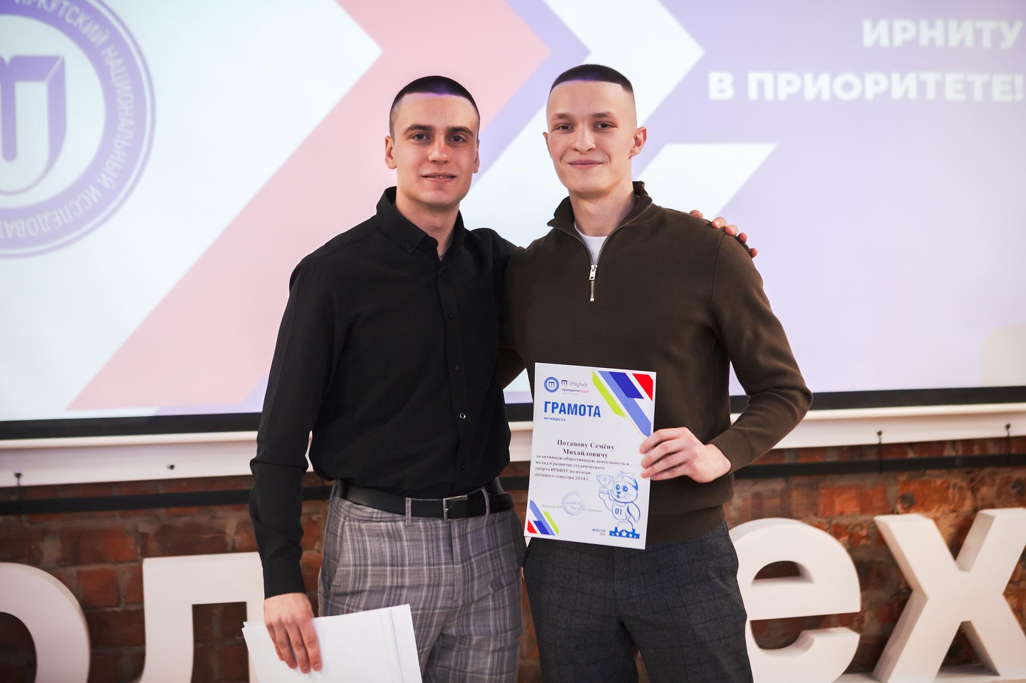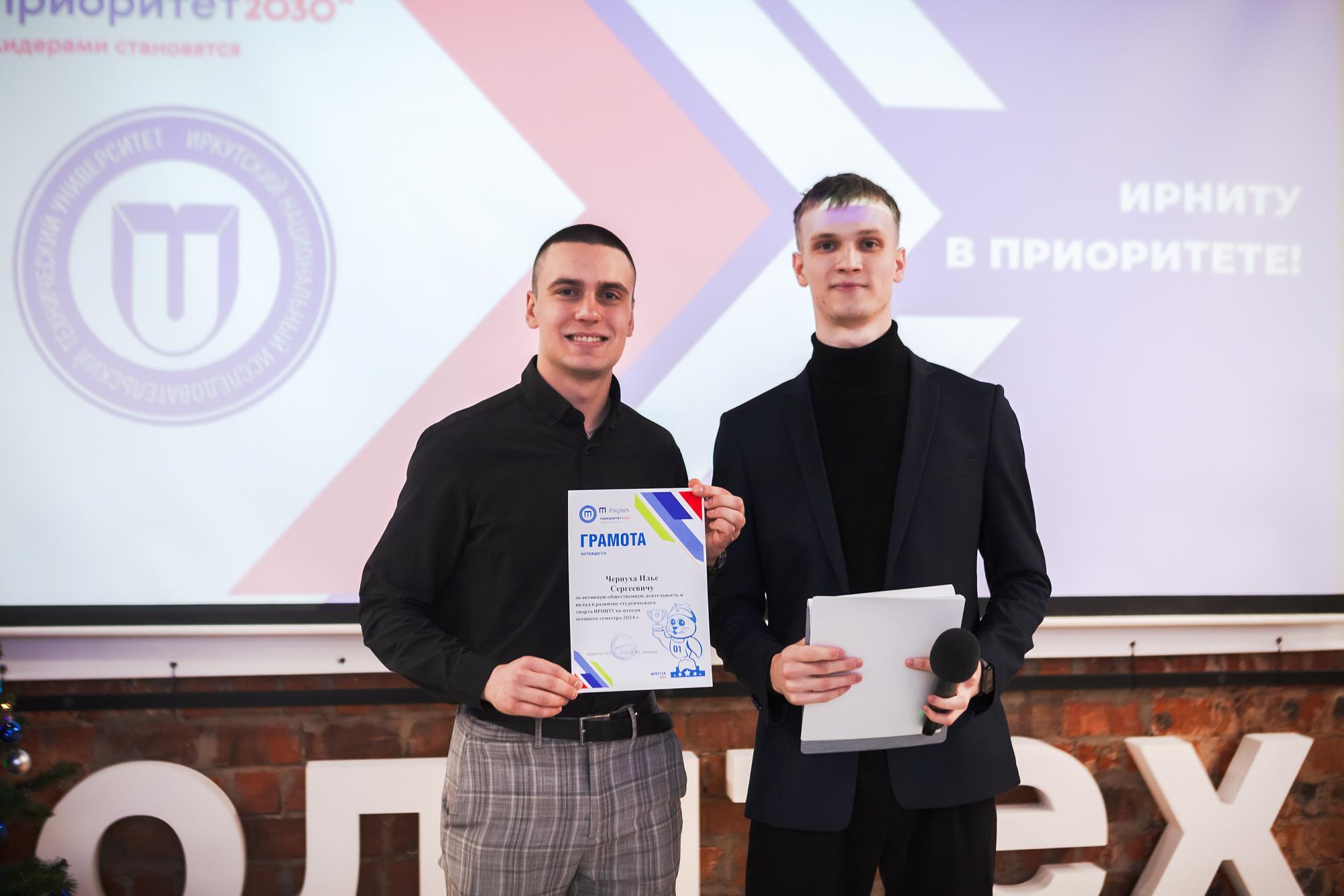 Председатель ССК «ИРНИТУ» Илья Чернуха отметил грамотами своих коллег – 16 событийных менеджеров. Студенты организуют мероприятия, занимаются дизайном и медиа, работают со спонсорами и др.