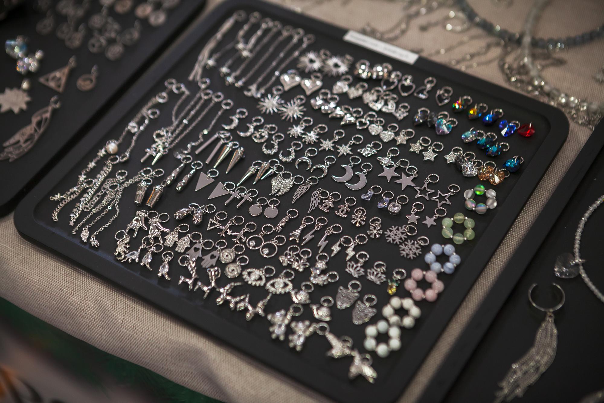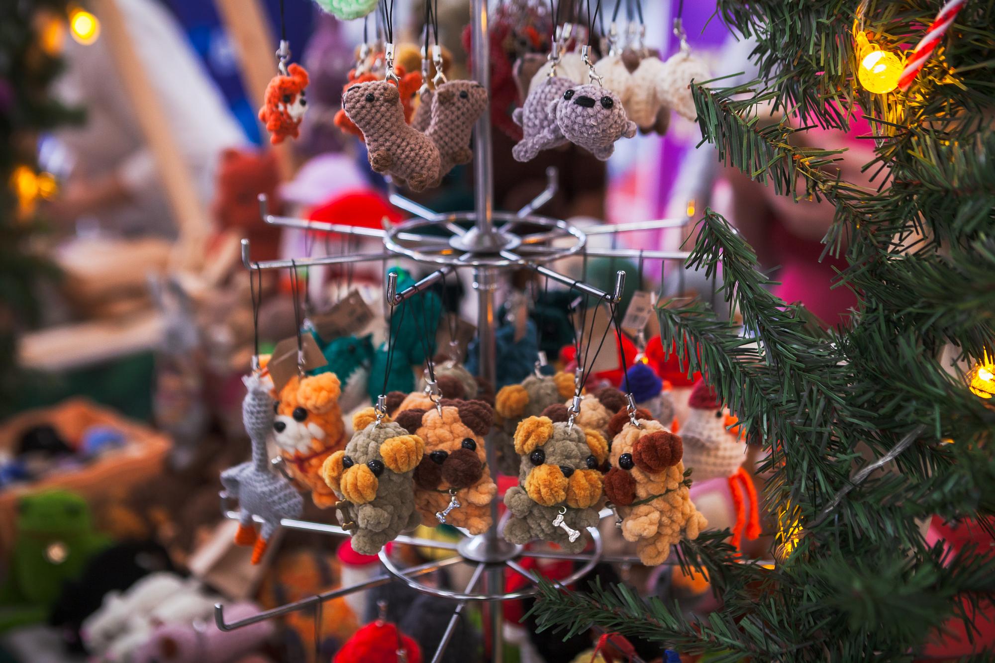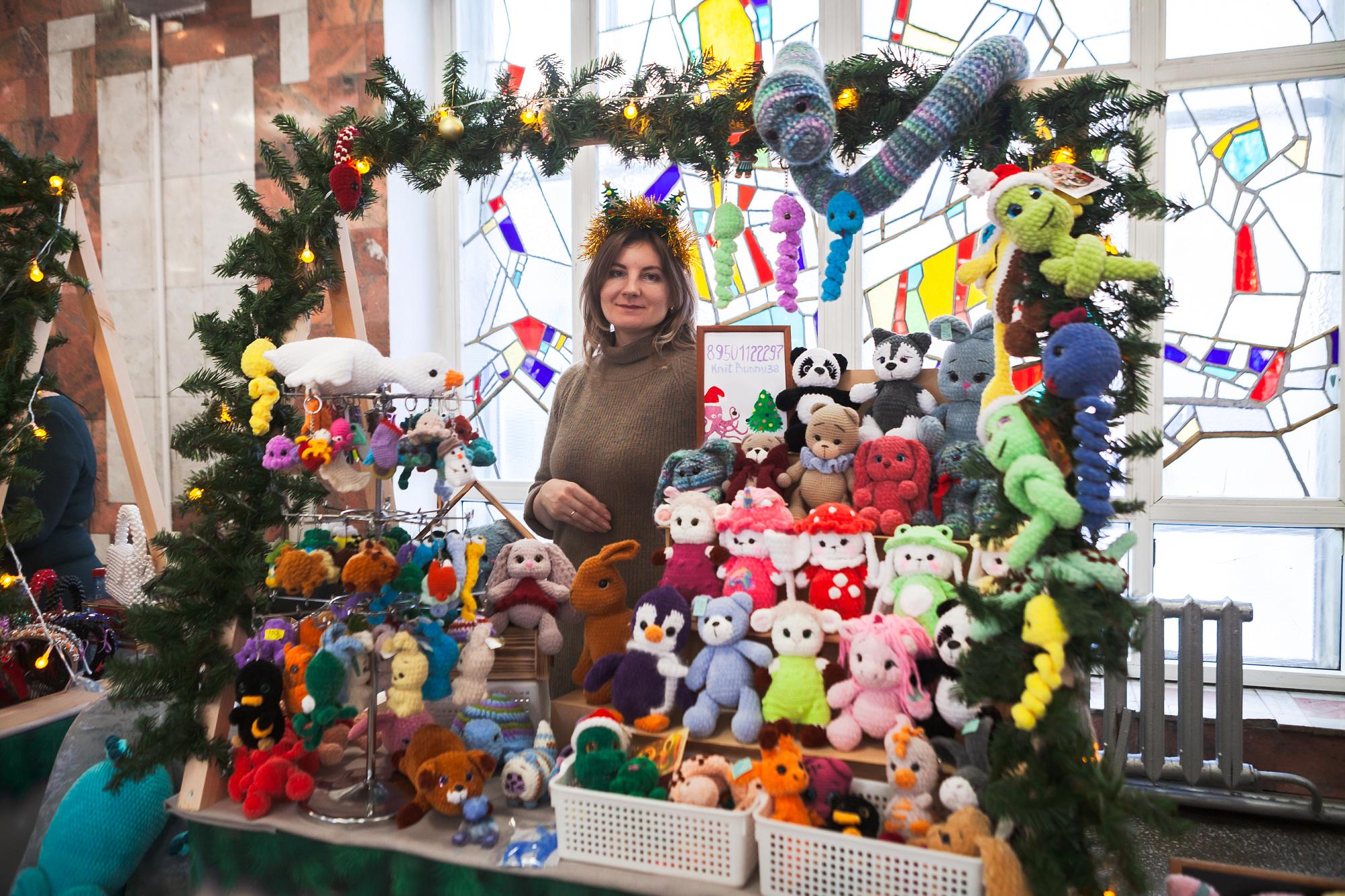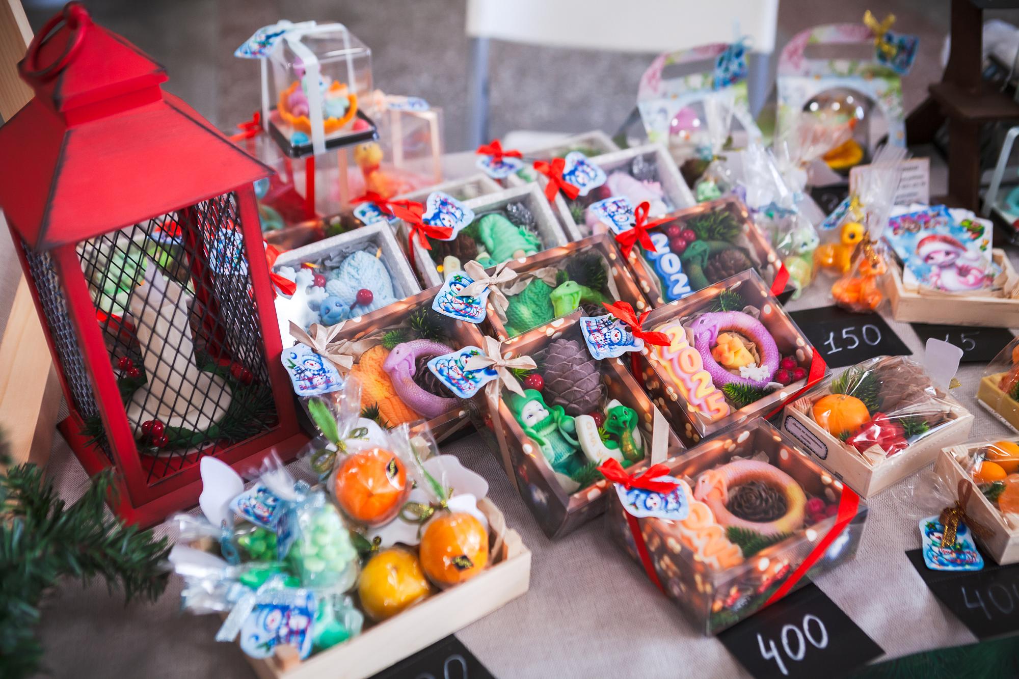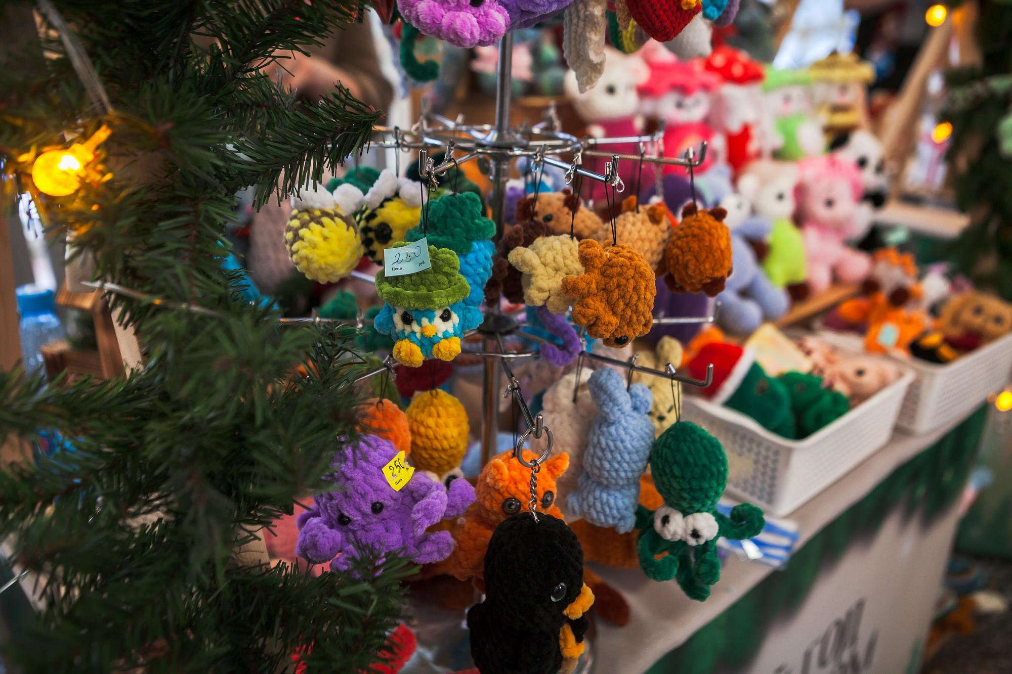 На ярмарке всем желающим предложили приобрести разноцветных вязаных зверят. Мягкие игрушки порадуют детей и отлично украсят елку. Любительницы бижутерии обратили внимание на цепочки и подвесы в форме полумесяца, снежинки, звезд, знаков зодиака и др. Не менее популярными оказались женские украшения из стекла, а также декоративное мыло – композиции, напоминающие шишки, мандарины, сибирские годы, снежинки и варежки.