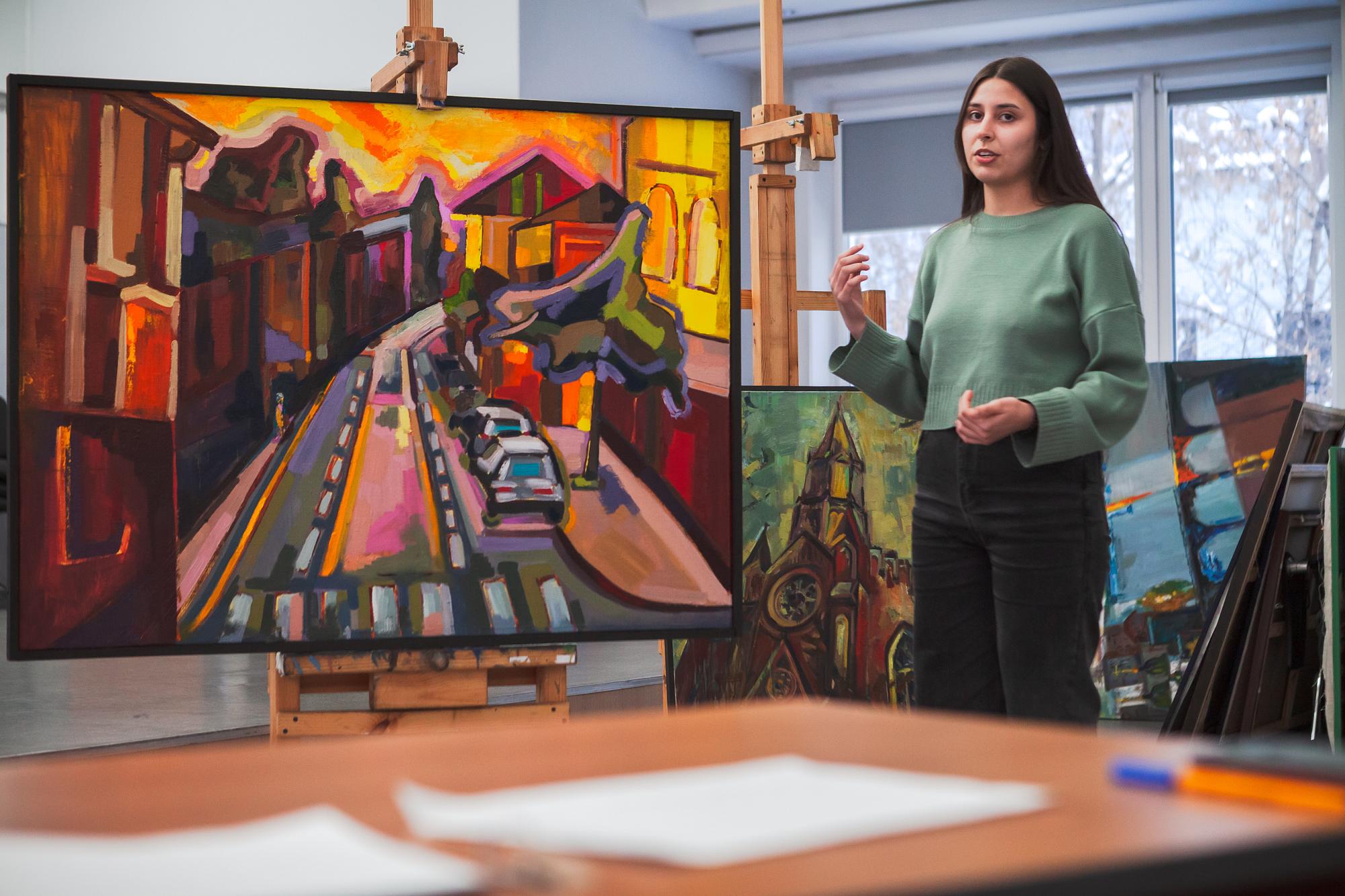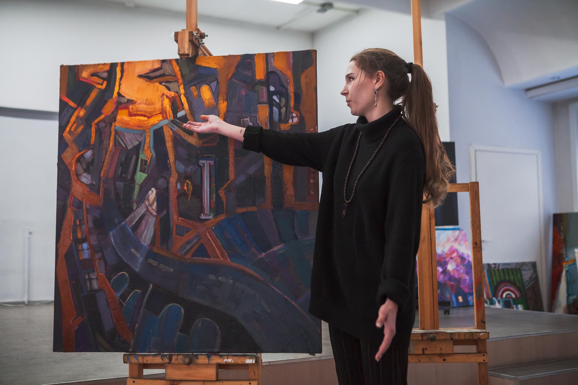 Ксения Одинаева презентовала картину с изображением вида на улицу Карла Маркса из окна художественного училища. Пространство на рисунке окрашено в багровые, синие и золотые цвета. Ксения живет в Ангарске, но любит прогуливаться и по Иркутску. Улицу Карла Маркса считает одной из самых живописных. Создавая картину, она запечатлела вечернюю атмосферу, когда город постепенно смолкает, а свет от фонарей и окон делают Иркутск уютным.