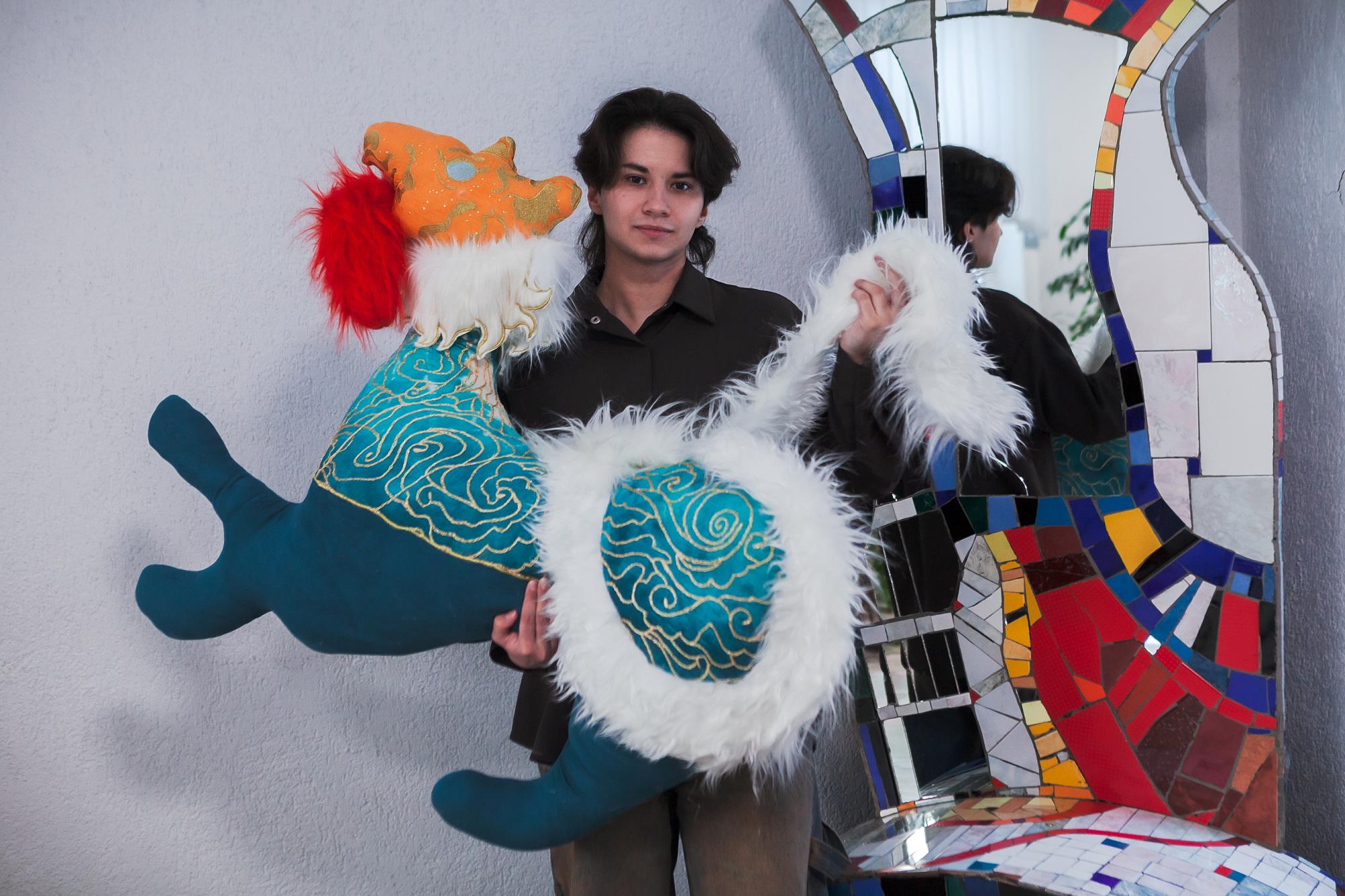 Будущий архитектор Герман Емельянов впечатлил экспертов мягкой игрушкой в виде сине-огненного бабра. Изделие, относящееся к текстильной скульптуре, украшено золотистыми облаками.