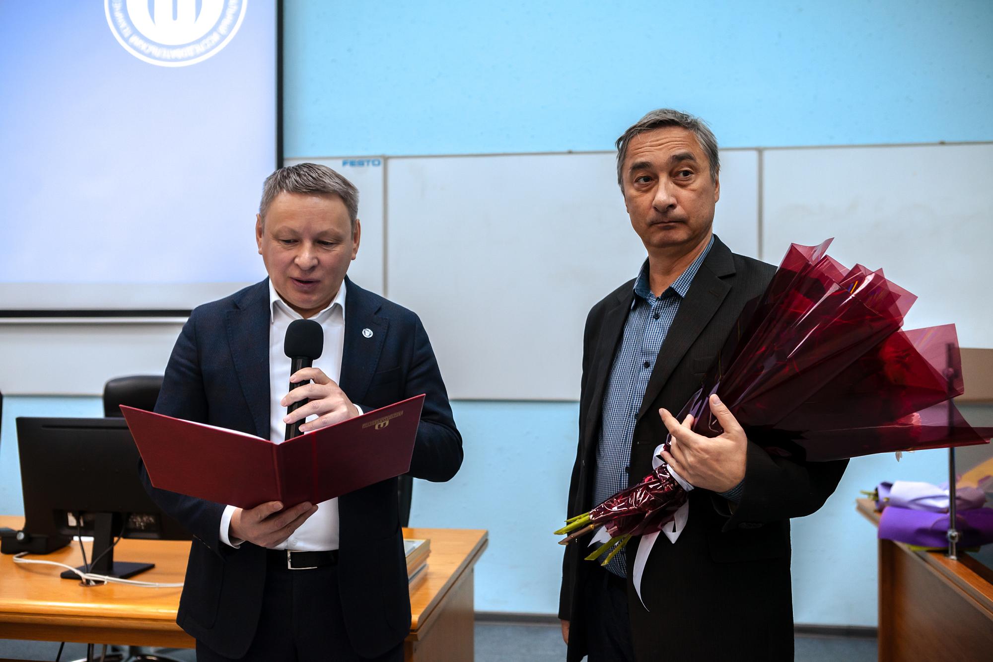 Зачитывая поздравление, Михаил Корняков подчеркнул вклад политеховца в развитие науки и образования:
