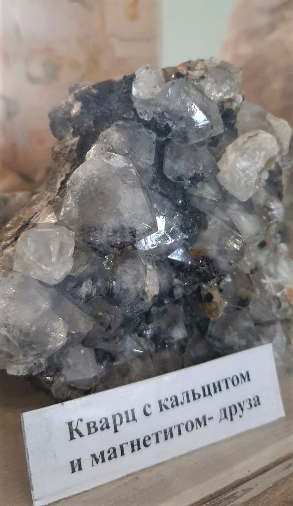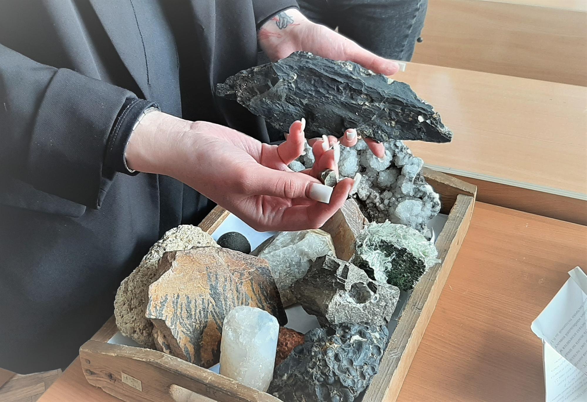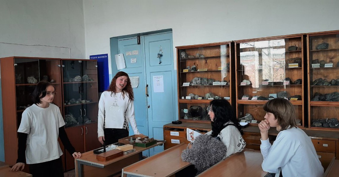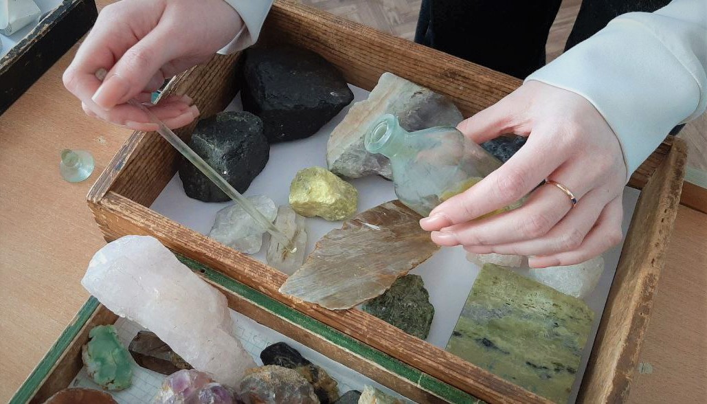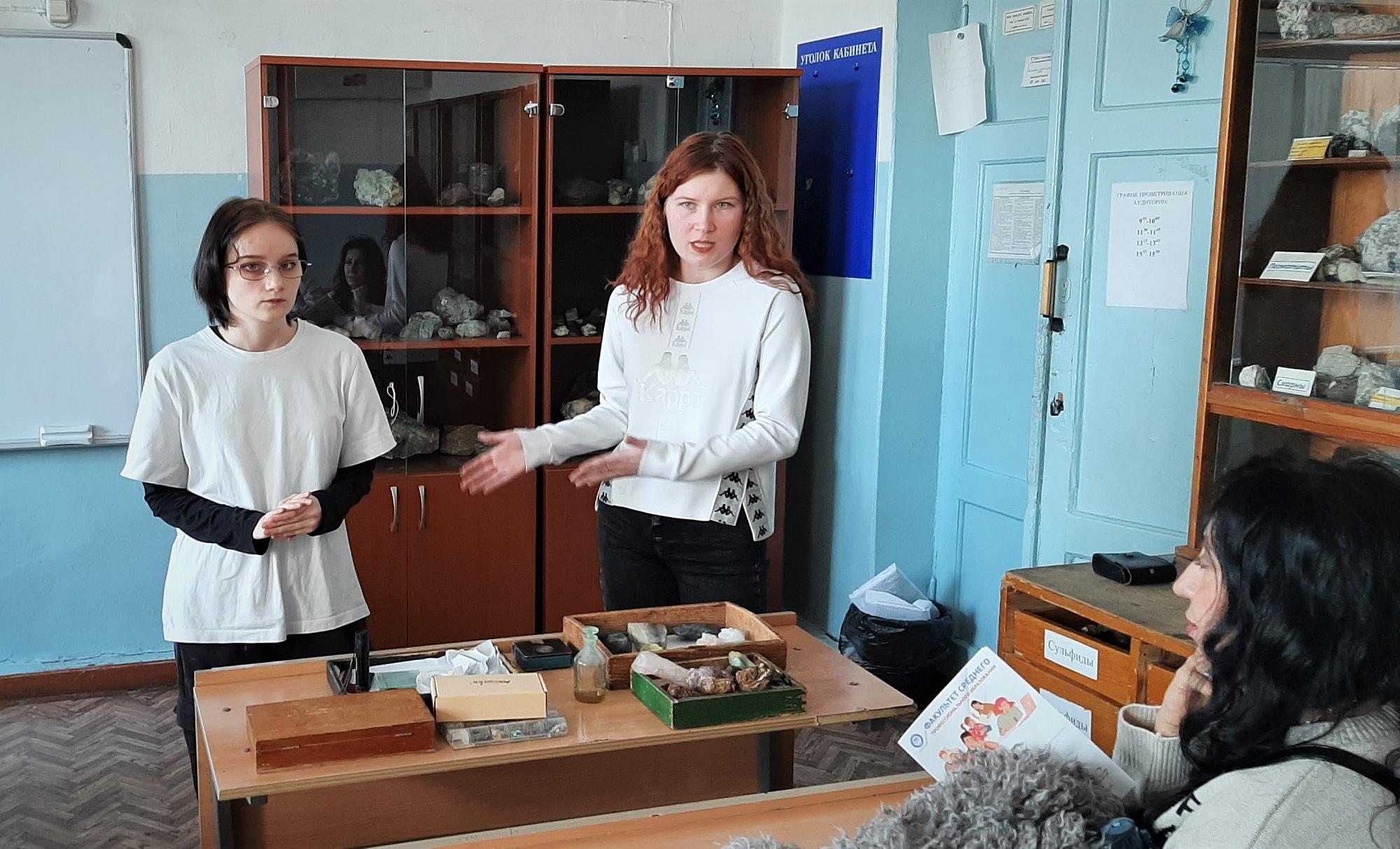 Татьяна Минова провела экскурсию по минералогическому музею техникума, подробно рассказав о местах добычи и сферах применения минералов. Например, белый цеолит используют как природный фильтр для воды, полевые шпаты служат материалом для стекольной и фарфоровой промышленности.