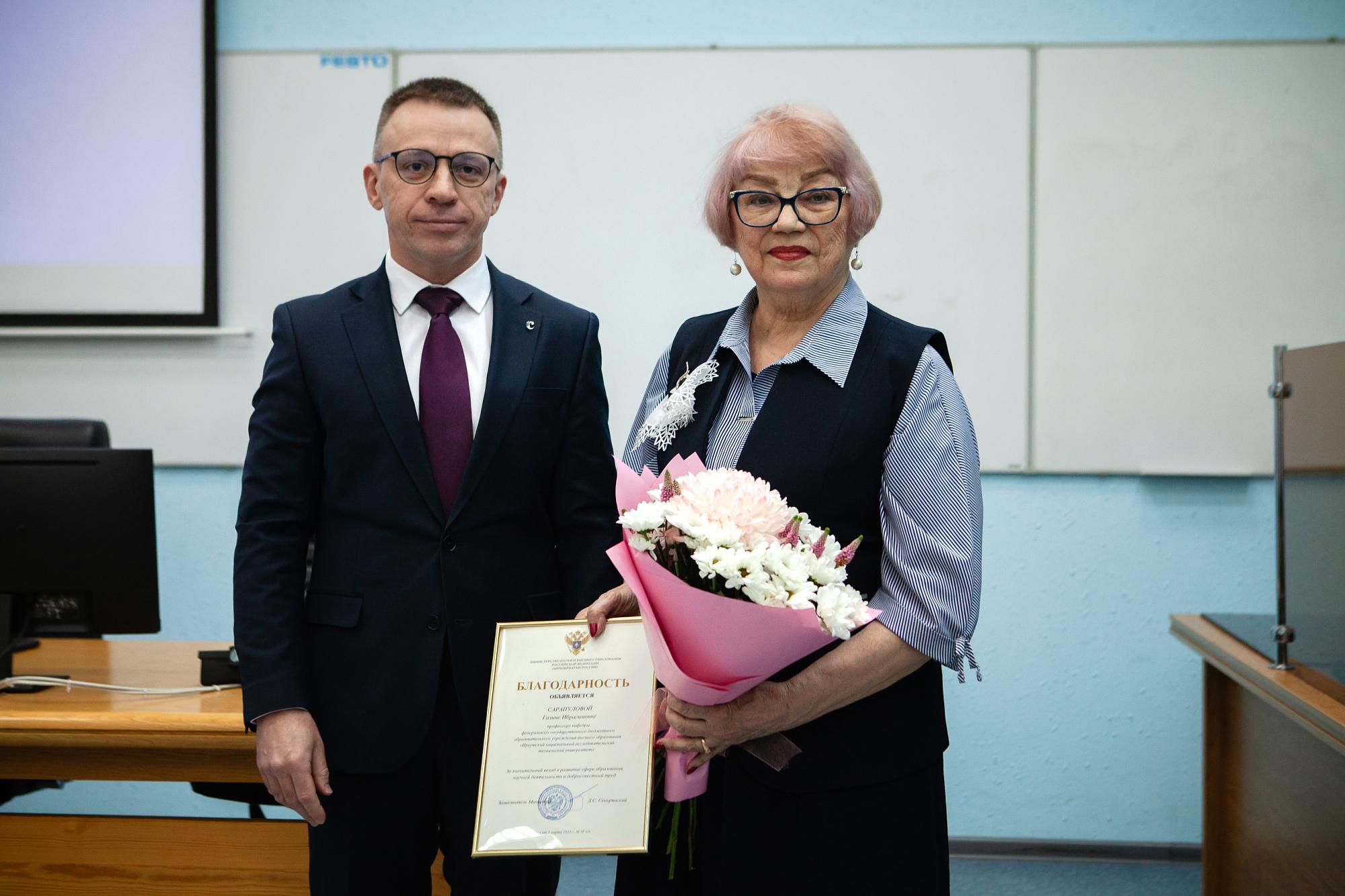 Благодарности Минобрнауки РФ получили профессора кафедры обогащения полезных ископаемых и охраны окружающей среды им. С.Б. Леонова Галина Сарапулова и Валентина Домрачева. В документах отмечается добросовестный труд и значительный вклад сотрудников ИРНИТУ в развитие образования, научной деятельности. Благодарности коллегам вручил проректор по учебной работе Владимир Смирнов.