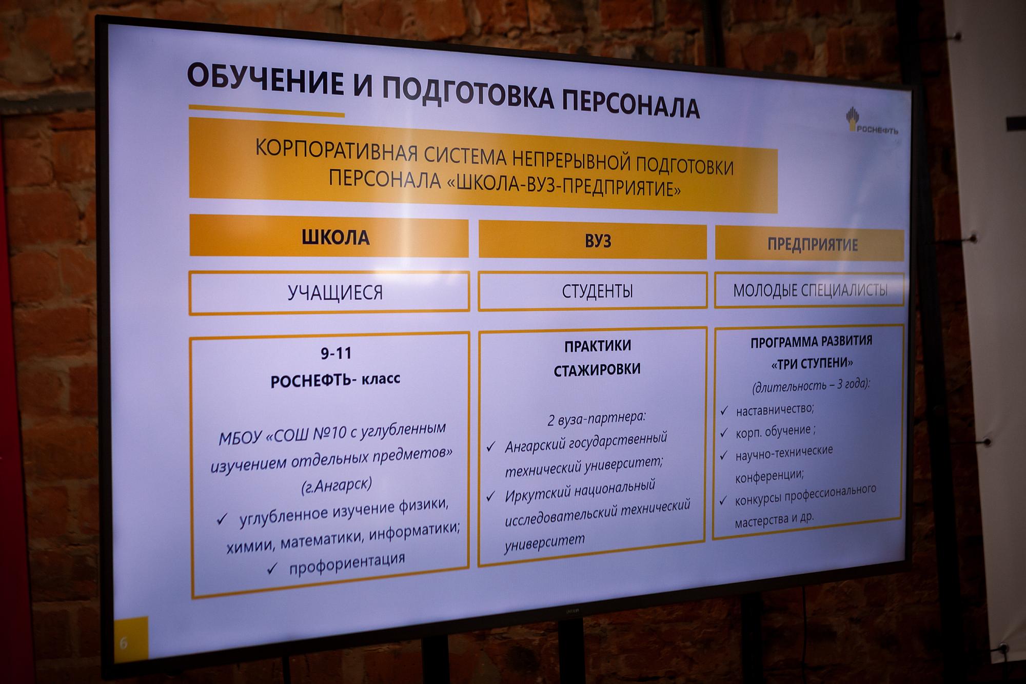Спикер рассказал о вертикальном и горизонтальном треках, корпоративной системе непрерывной подготовки кадров. Первым этапом в этой системе является обучение в «РОСНЕФТЬ-классе», открытом при поддержке Иркутского политеха. АНХК ищет талантливую молодежь через стажировки и целевое обучение (лучшим студентам выплачивают стипендии в размере 10 тысяч рублей). На предприятии действует программа «Три ступени», согласно которой, за молодым специалистом закрепляется наставник, помогающий адаптироваться на производстве. Иногородним оплачивается аренда жилья в Ангарске. Сотрудники могут оформить ипотеку на льготных условиях, воспользоваться ДМС, отдохнуть на Кубе или получить путёвки для детей в летний лагерь.