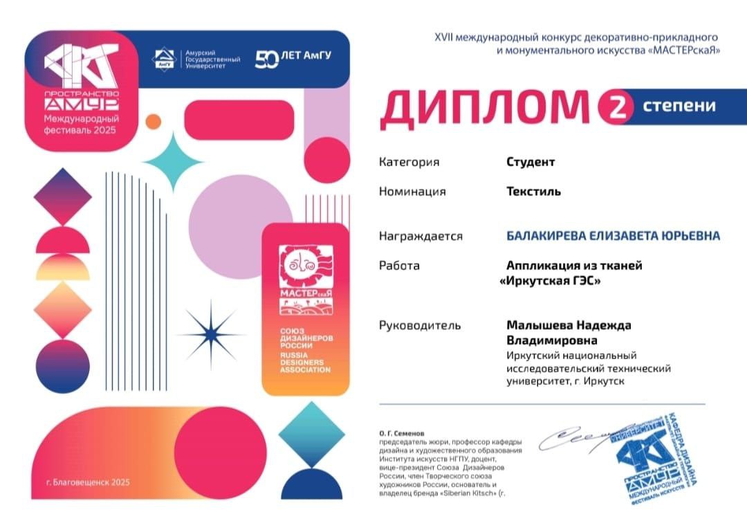 Ученица Надежды Малышевой, студентка Елизавета Балакирева придумала тканевую аппликацию «Иркутская ГЭС», за что получила второе место.