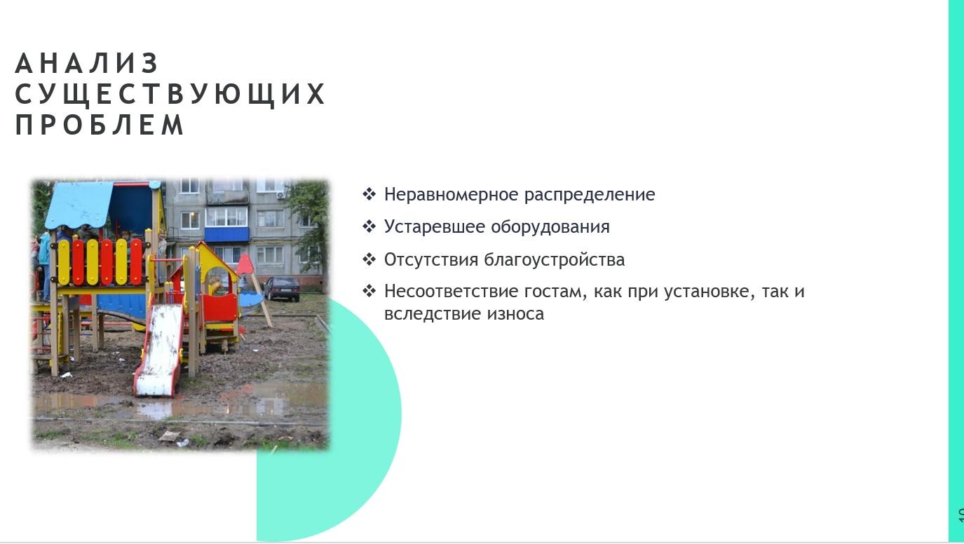 «Выяснилось, что в разных местах проблемы примерно одинаковые: часть пространств устарела или сделана из недолговечного пластика, встречаются проржавевшие горки, игровые зоны без покрытия. Также мы нашли объекты, не соответствовавшие ГОСТам, как при установке, так и вследствие износа. Исключением стали участок перед ЖК «Прогресс» (19 школа) и окрестности залива Якоби. На этих территориях есть комфортные и современные комплексы, песочницы, качели, канаты, скейтпарк, теннисный корт. Однако добираться до них неудобно, особенно жителям других районов», - рассказывает Нина Петрова.