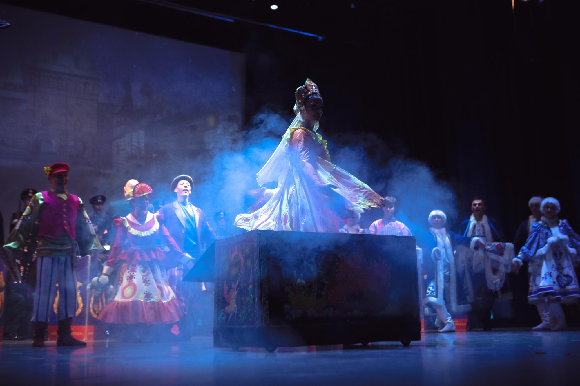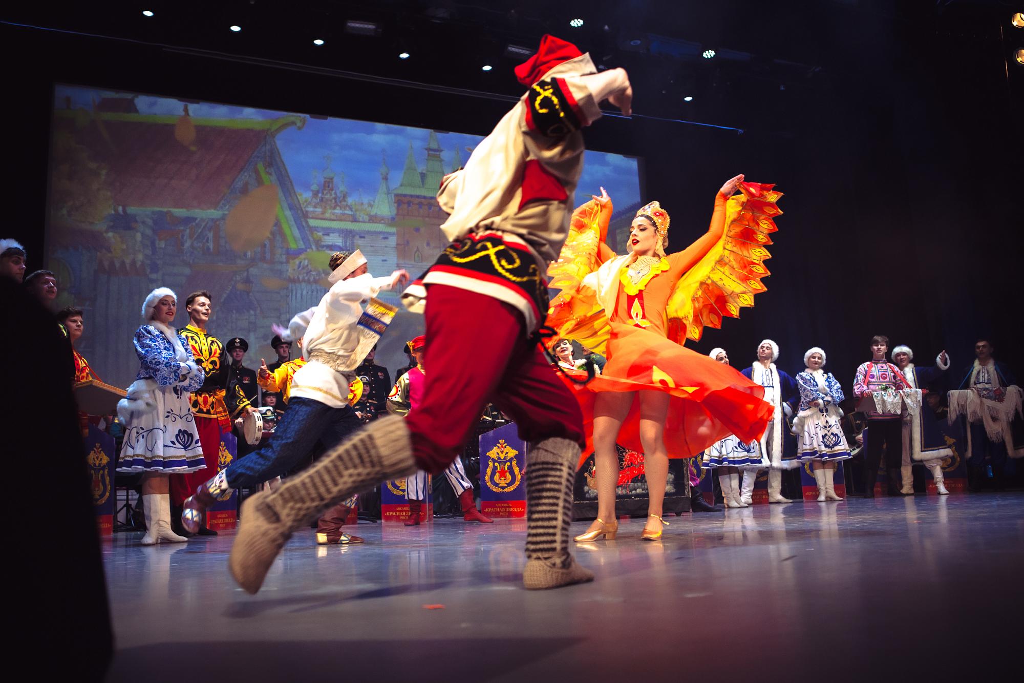 Затем зрителям показали танцевально-хоровую сюиту «Ярмарка». Это номер, который рассказывает о ярмарочных гуляниях как о зеркале русской души, отражая её широту, щедрость и жажду жизни. Создатели проекта уделили много внимания костюмам, вдохновившись сказкой о Жар-птице, разнообразием узоров хохломы, гжели и дымковской игрушки.