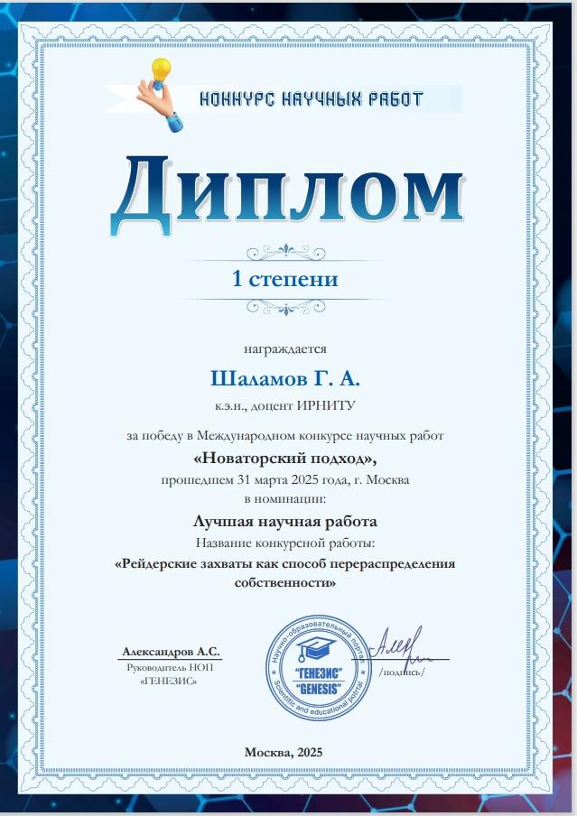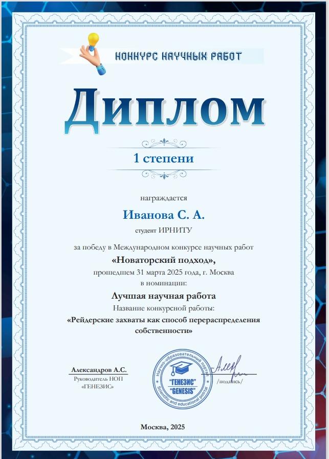 Доцент ИРНИТУ кафедры экономики и цифровых бизнес-технологий Георгий Шаламов и студентка Светлана Иванова выиграли международный конкурс «Новаторский подход». Они представили на суд жюри научную статью о перераспределении собственности в бизнесе.