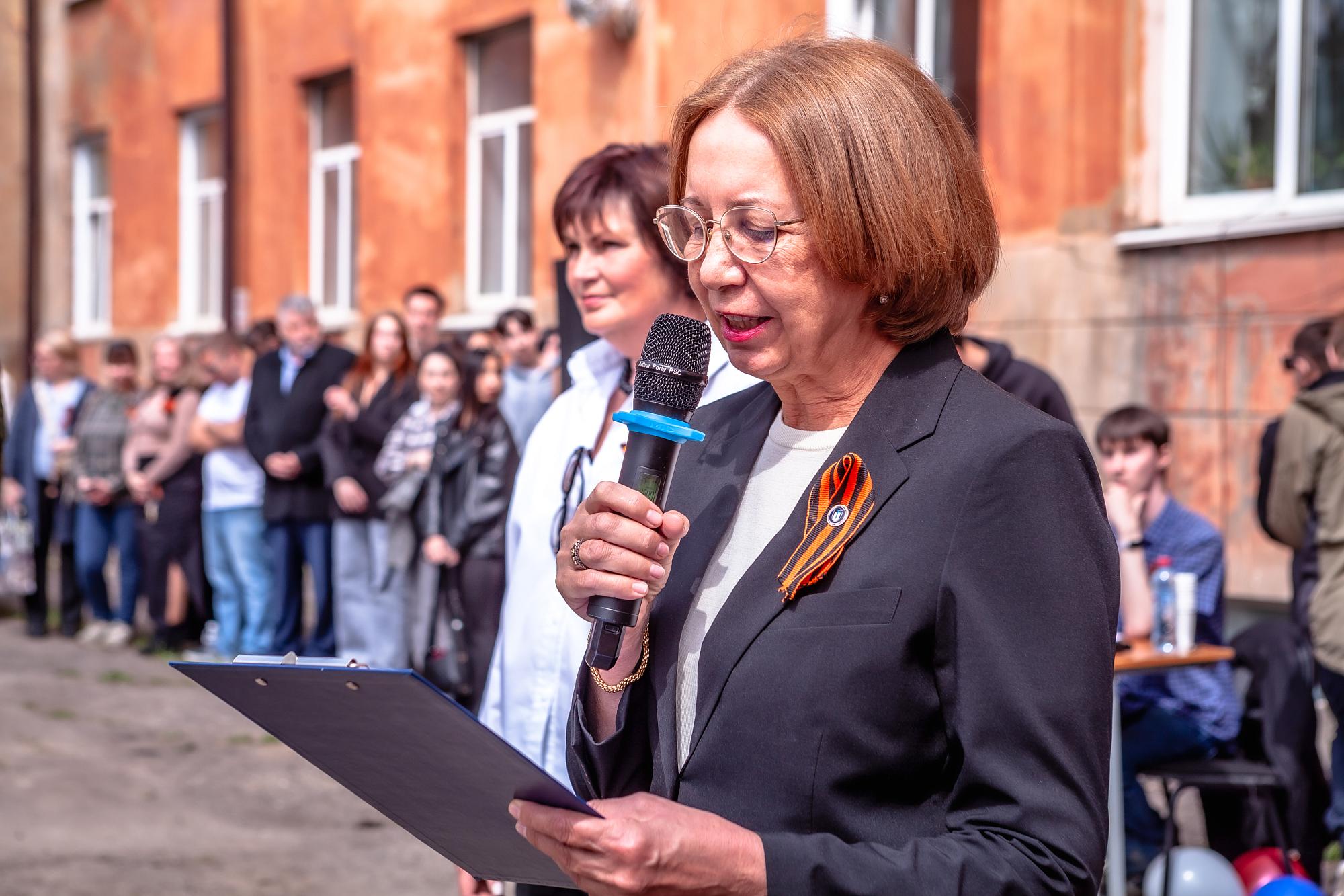 С приветственным словом выступила декан Факультета СПО Наталья Пельменева, прочитавшая строки из песни «Давным-давно была война»:
