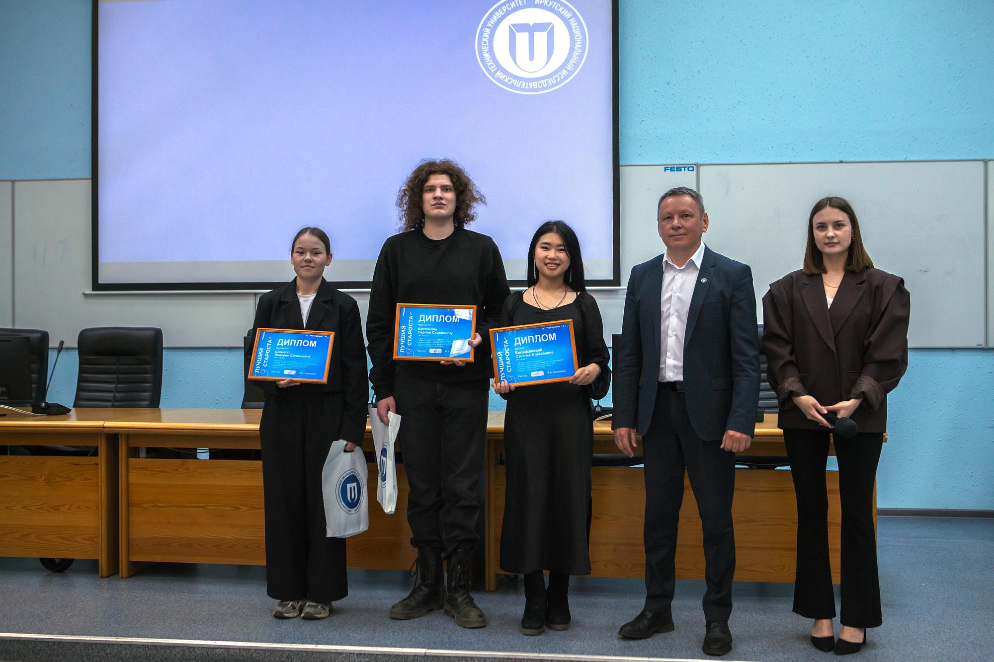 В Иркутском политехе подвели итоги конкурса «Лучший староста академической группы СПО ИРНИТУ». Награды победителям вручили ректор Михаил Корняков и замначальника управления по молодежной политике Кристина Веретенникова.