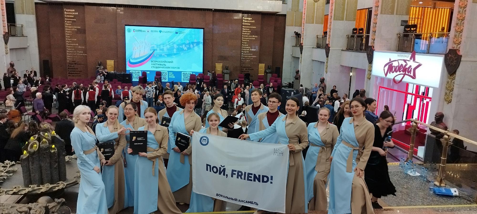 Народный коллектив – вокальный ансамбль «Пой, Friend!» ИРНИТУ стал лауреатом I Всероссийского фестиваля студенческих хоров. Мероприятие состоялось 15-19 мая в Музее Победы (Москва). В гала-концерте приняли участие 14 студентов и руководитель ансамбля Галина Гиленова.