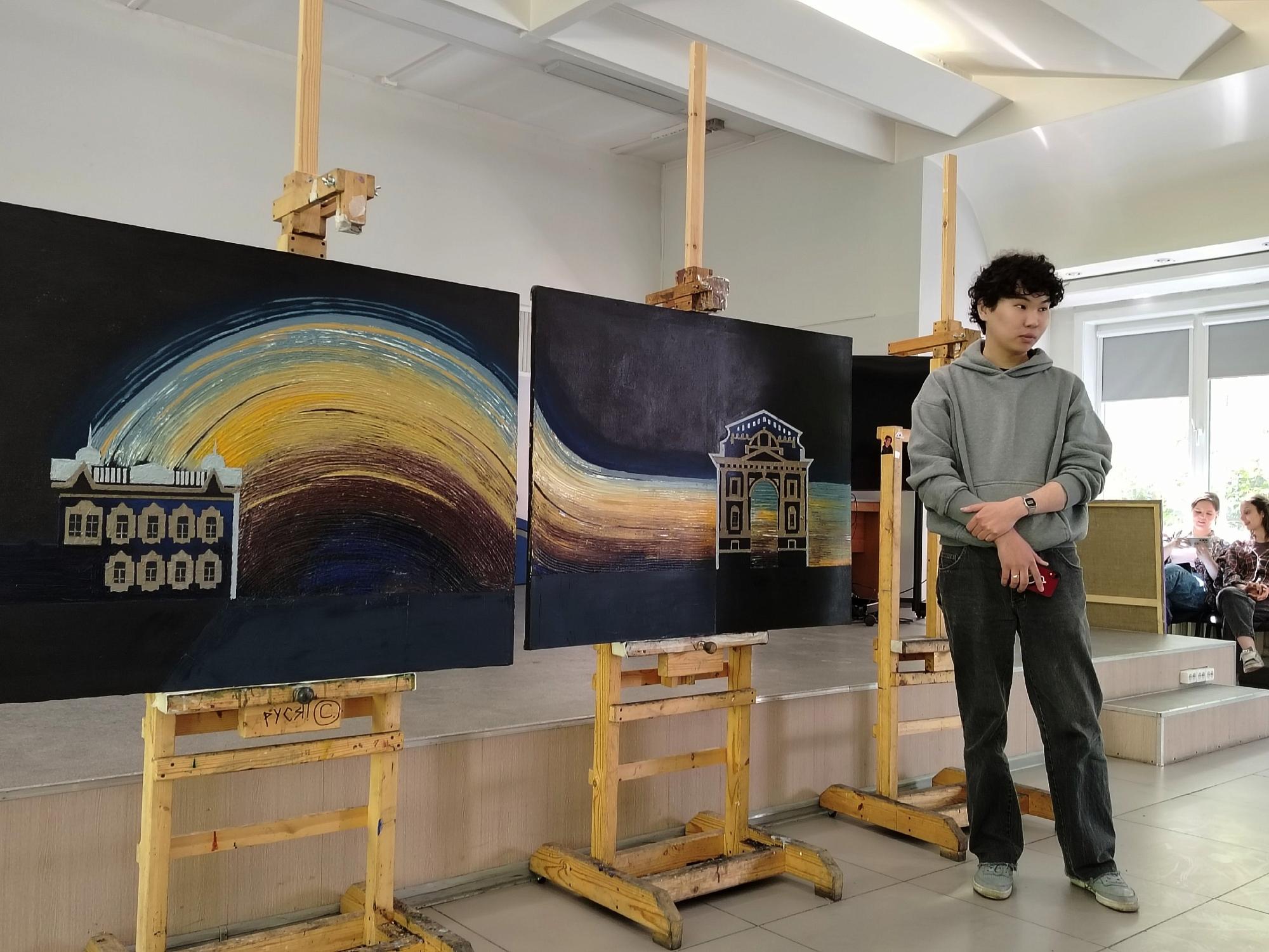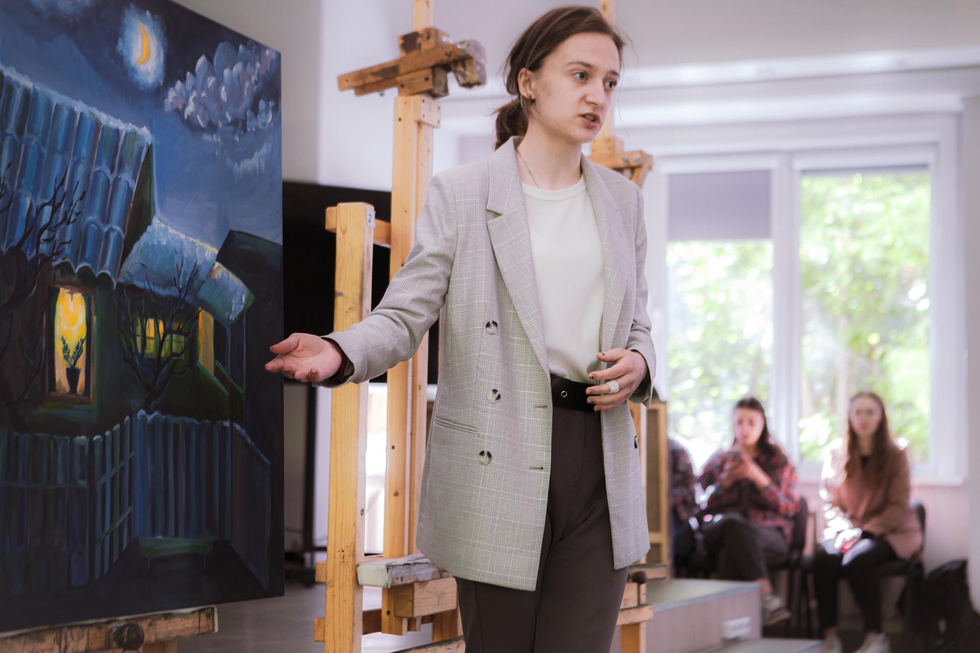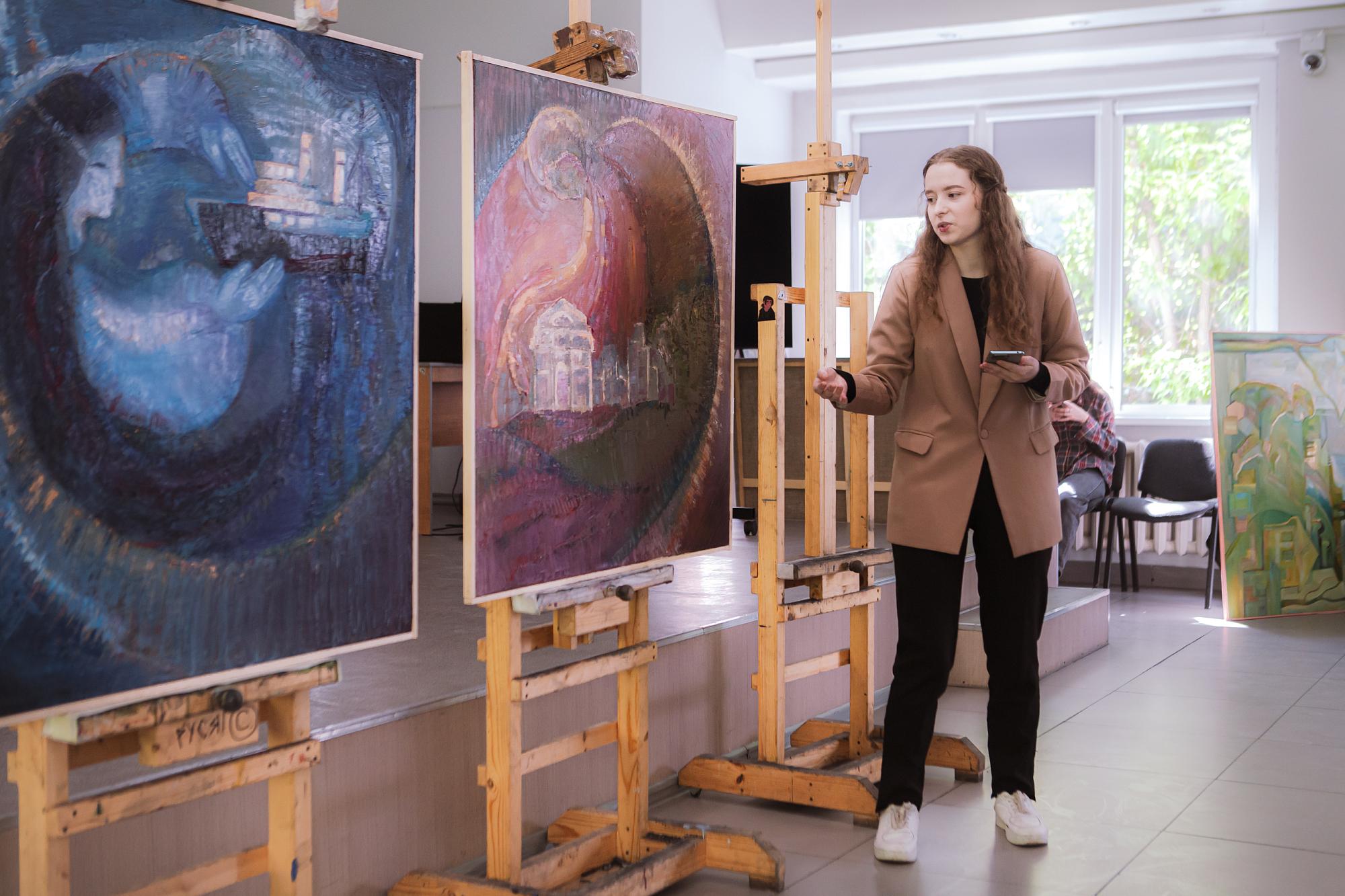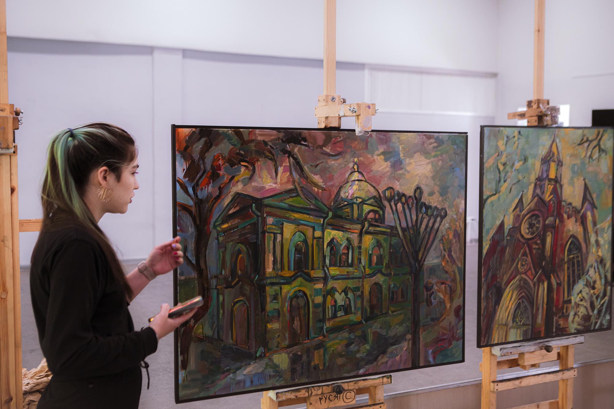 Первыми выступили студенты, претендующие на участие в выставках областного художественного музея. Анастасия Ревина подготовила триптих, изобразив масляными красками Казанскую церковь, Собор Богоявления Господня и Князе-Владимирский храм. Елизавета Полонская также акцентировала внимание на религиозной архитектуре, показав синагогу и римско-католический Приход Успения Богородицы. Ксения Одинаева и Елизавета Балакирева заинтересовались природными стихиями, «принимающими город в свои объятия».
