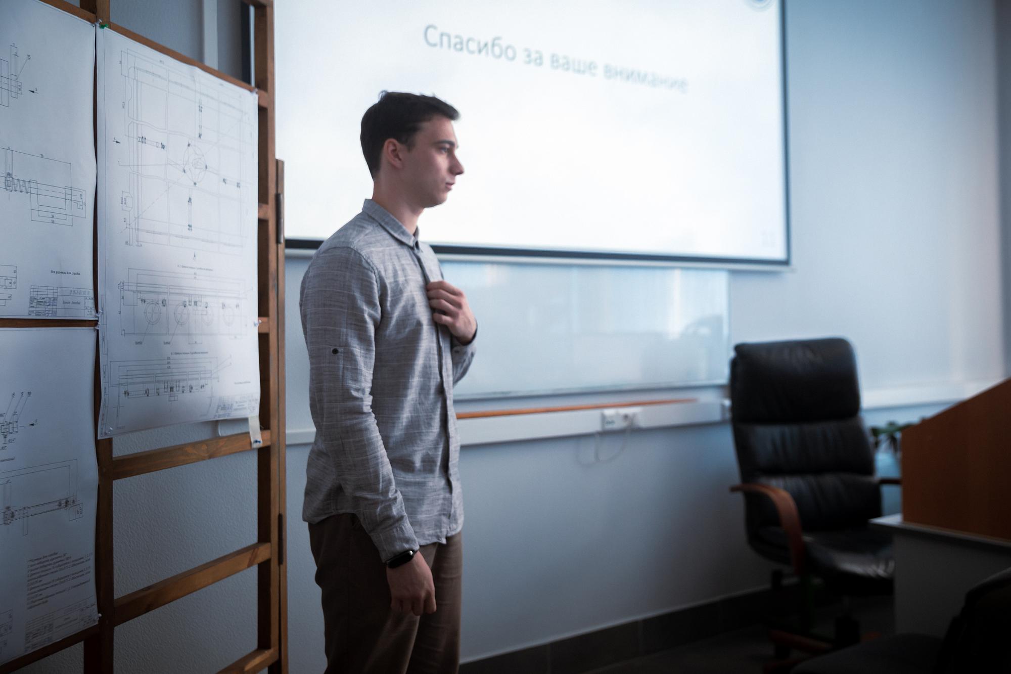 Первым на защиту вышел Александр Назаренко, который представил ВКР на тему «Модернизация переднего люка специального назначения пассажирской кабины самолёта SSJ-100». Руководитель – Игорь Бобарика. За время обучения Александр принимал участие в инженерных олимпиадах, проходил практику на Иркутском авиазаводе – филиале ПАО «Яковлев», в авиакомпании «ИрАэро», S 7 ENGINEERING.