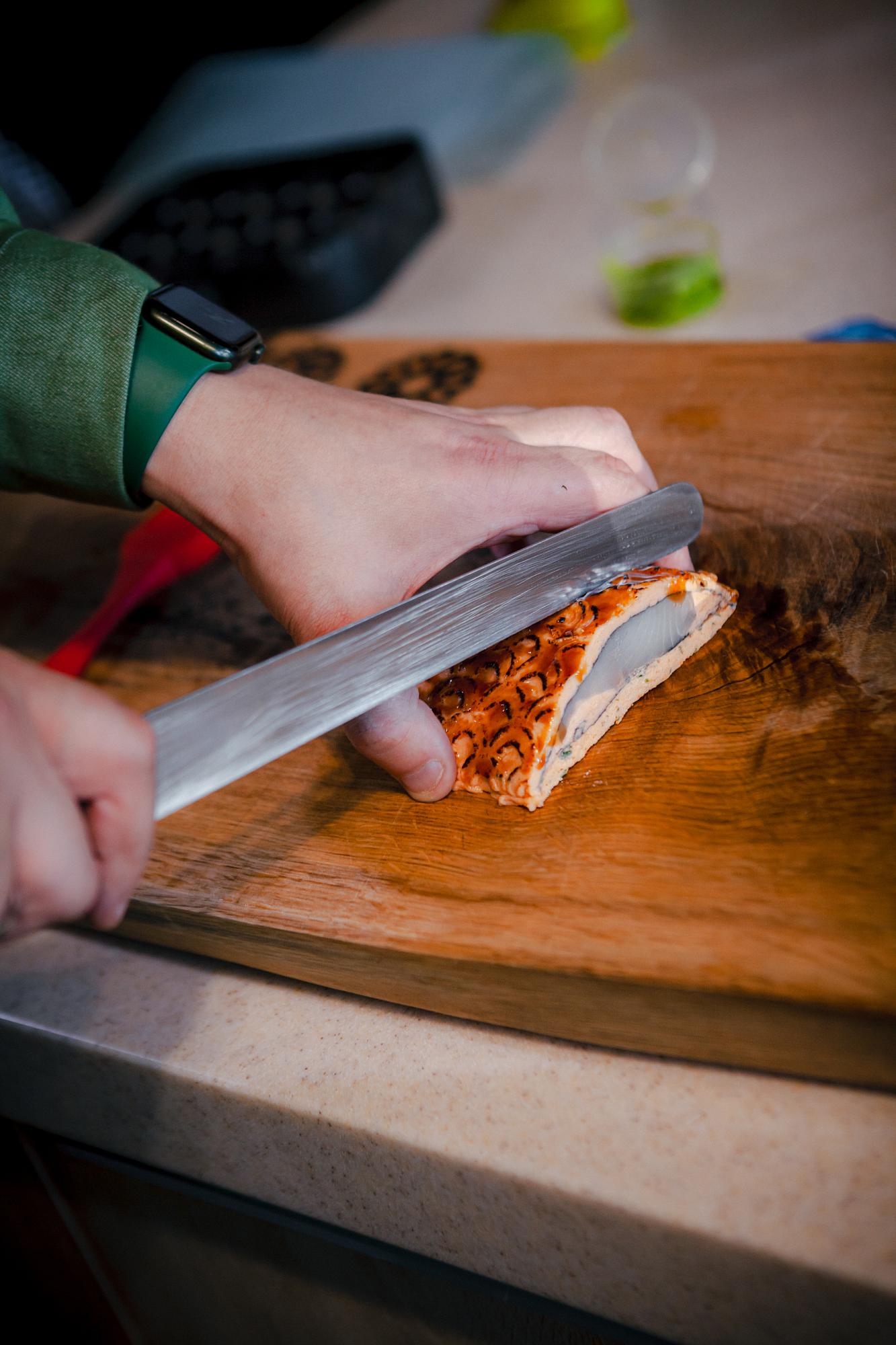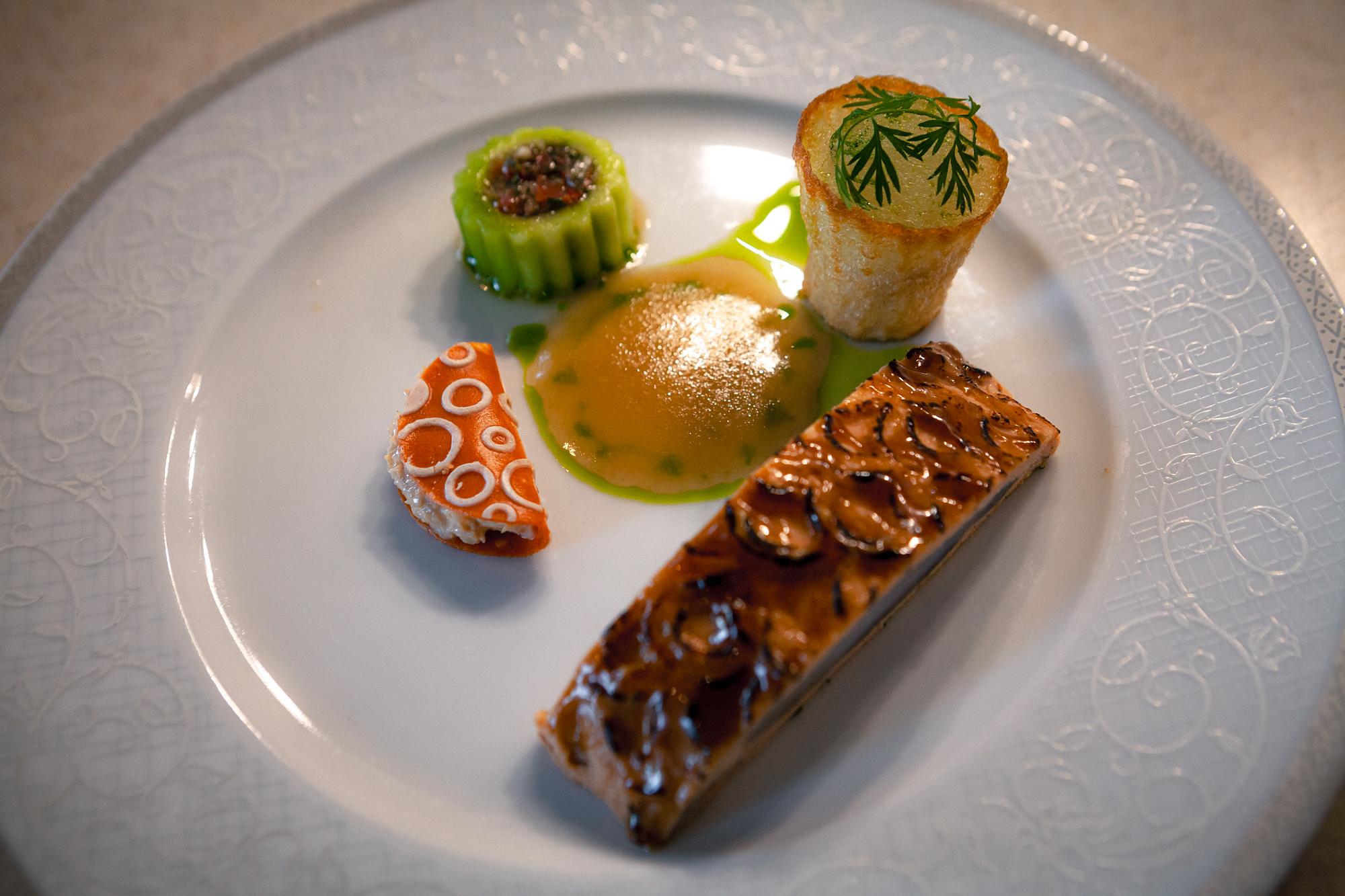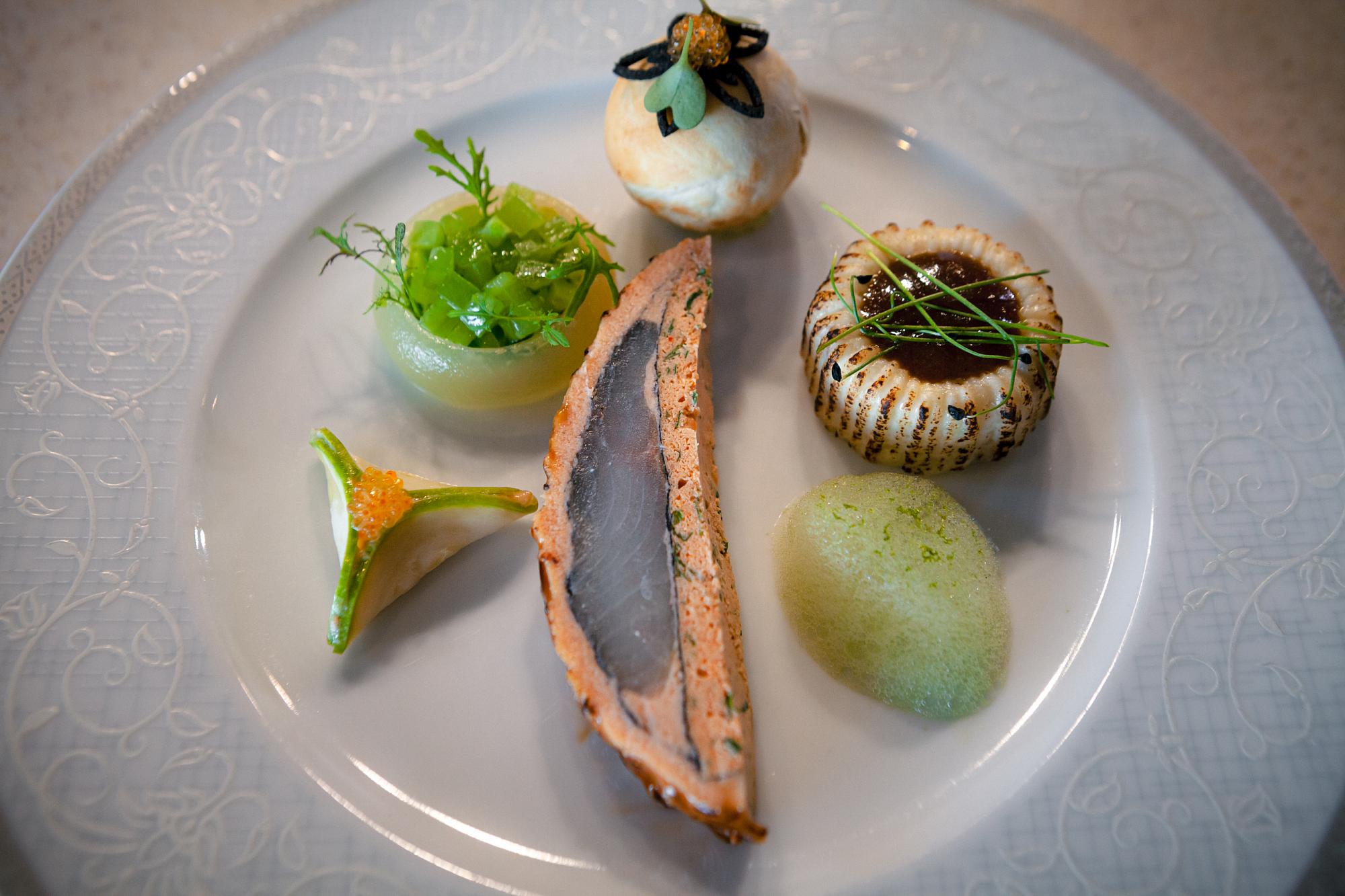 Шеф показал, как сделать малосольный сиг, паштет из красной рыбы, сливочно-кедровую кашу, салат с томатами конкассе, тимьяном и розмарином. Также он приготовил тарталетки с огуречным муссом, равиоли с икрой омуля и копчёным сигом.