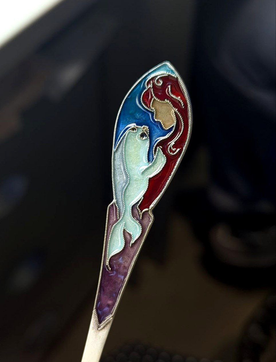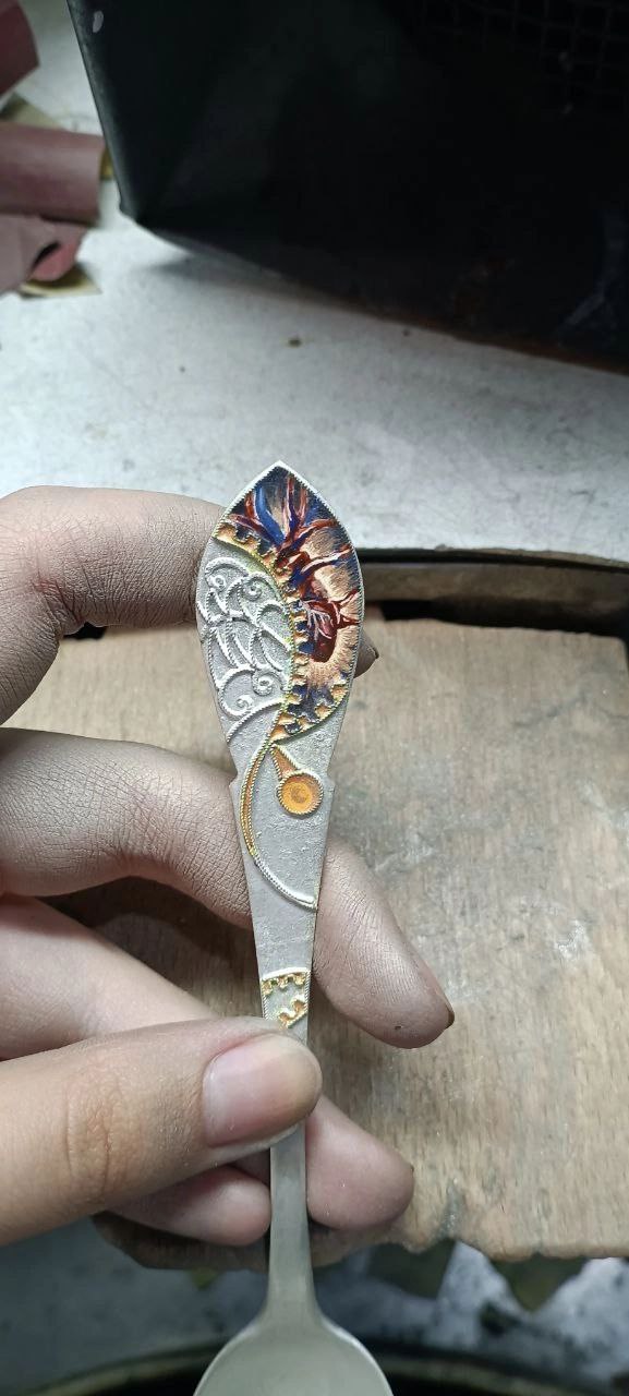 «На своей ложке я изобразила нерпу с девушкой, символизирующих союз природы и человека. Далее следовала пайка с помощью буры и припоя. Для того, чтобы эмаль легла ровно, нужно предварительно отшлифовать изделие вручную.