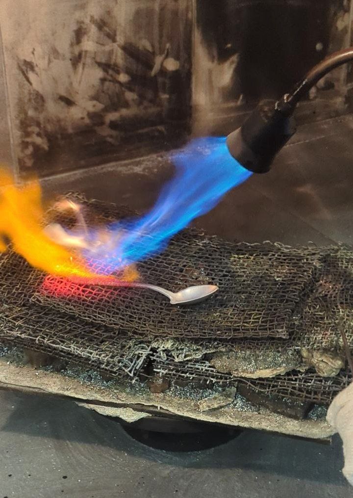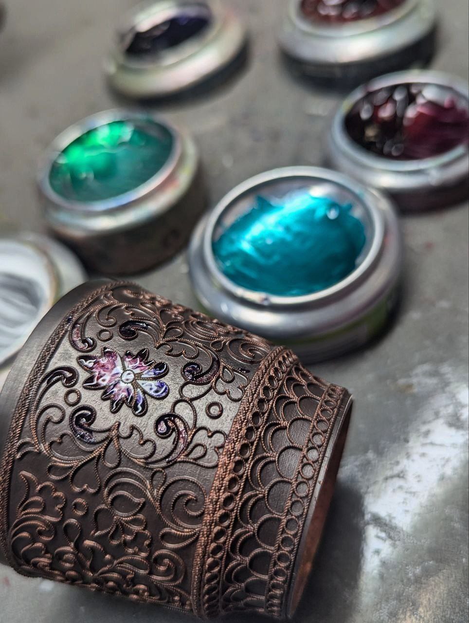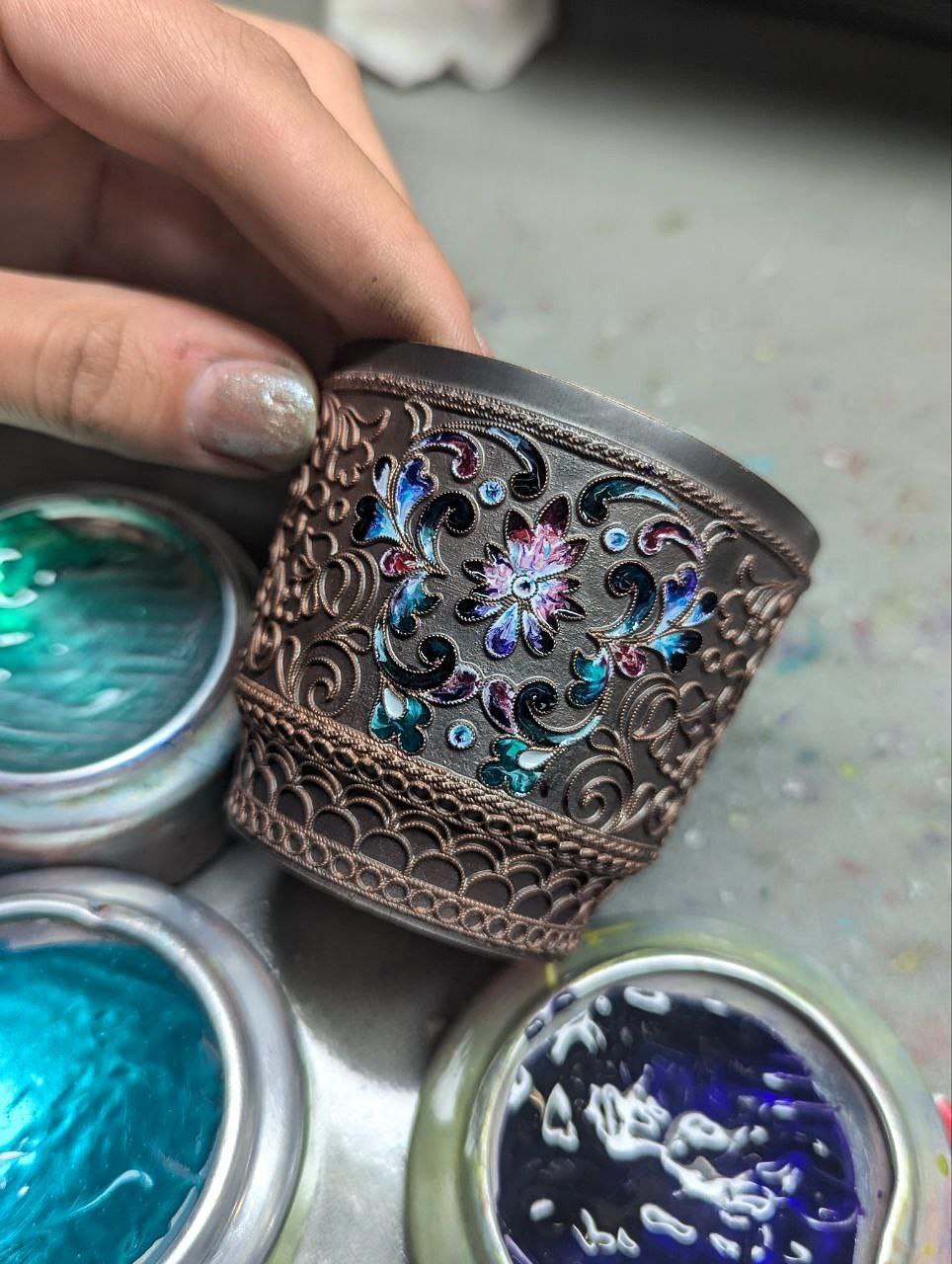 Самый интересный этап: мы определились с цветами по палитре и начали прокладывать эмаль шпателем. Кстати, изначально горячая эмаль представляет собой стеклянный порошок мелкой фракции. Поэтому выложив один слой, необходимо просушить изделие и поместить его в муфельную печь при температуре 780 С°. Так мы сделали два слоя горячей эмали. Затем наступил этап крацевания изделия и его окончательной полировки», – описывает процесс Мария.