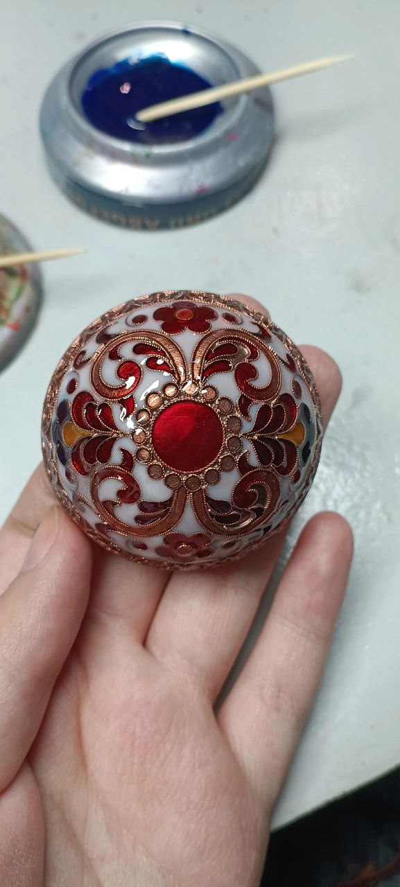 Полина Азарова успела поработать в цехах филиграни, монтировки, горячей и холодной эмали. Она научилась разводить краски для надглазурной росписи, выкладывать филигрань под горячую эмаль, замешивать и наносить холодную эмаль.