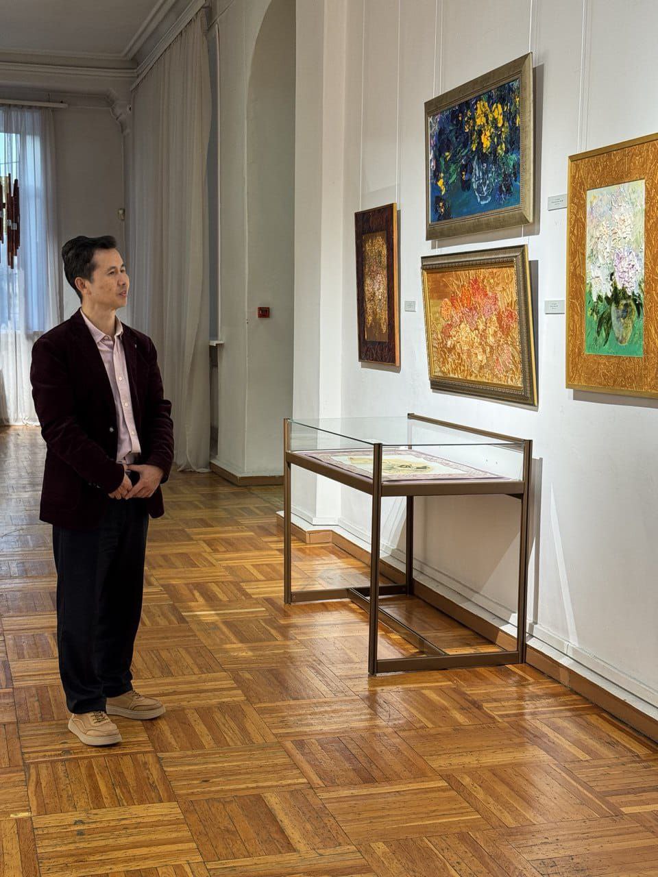 Особое место в творчестве профессора занимают пионы. Эти цветы украшают шелковые свитки, представленные им на выставке в корпусе «Г» Иркутского политеха. В коллекцию также вошли натюрморты, созданные в Нинбо его студентами из разных стран.