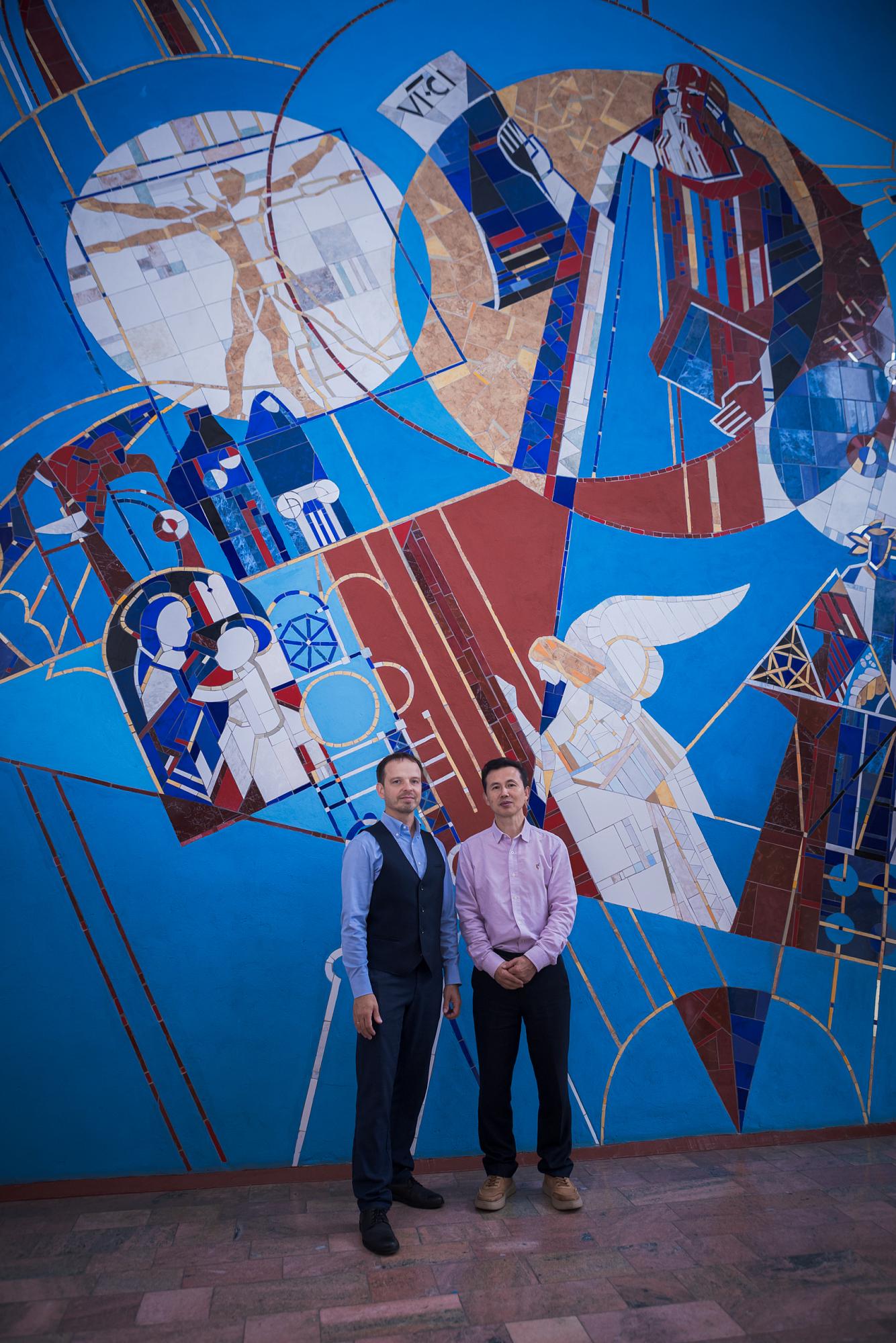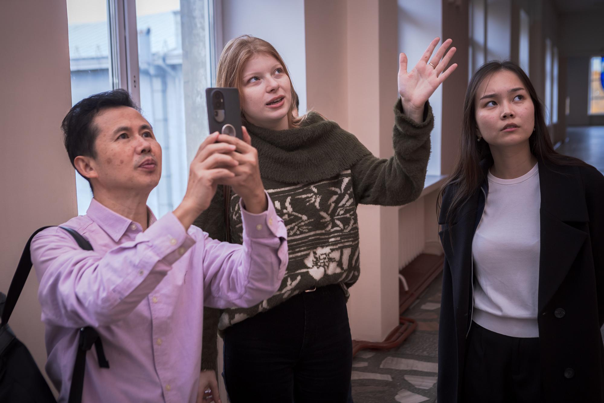 Кроме того, профессор побывал на экскурсии по главному корпусу ИРНИТУ, украшенному мозаикой, витражами и другими монументальными произведениями, созданными выпускниками вуза. Экскурсию провел заведующий кафедрой монументально-декоративной живописи и дизайна имени В.Г. Смагина Дмитрий Дорохин.