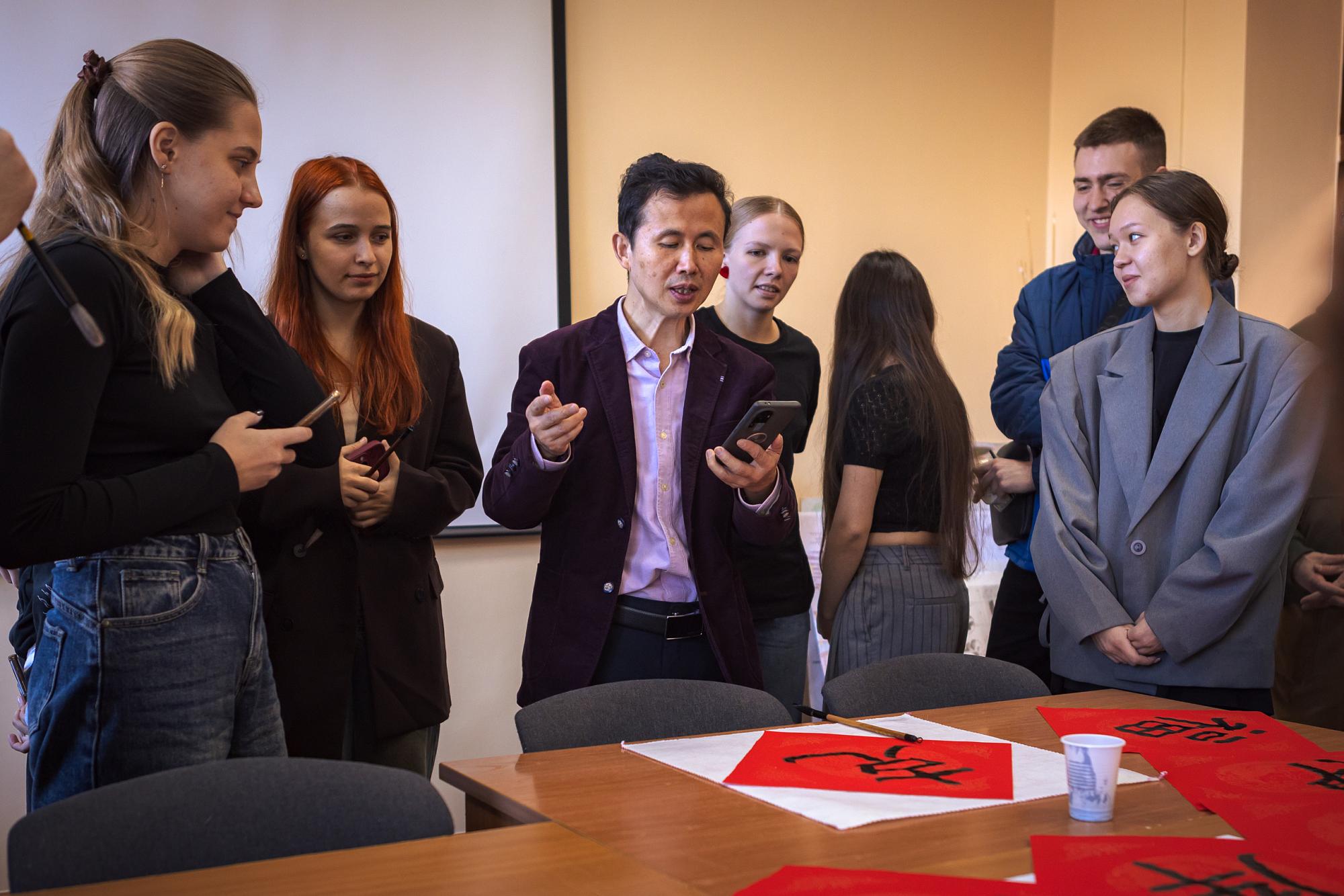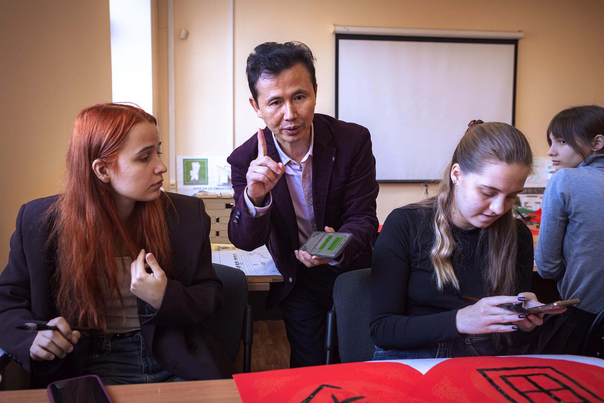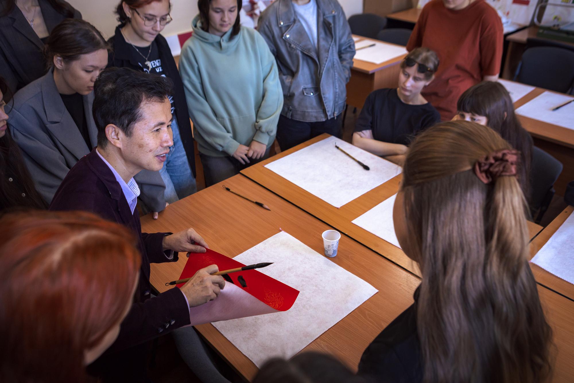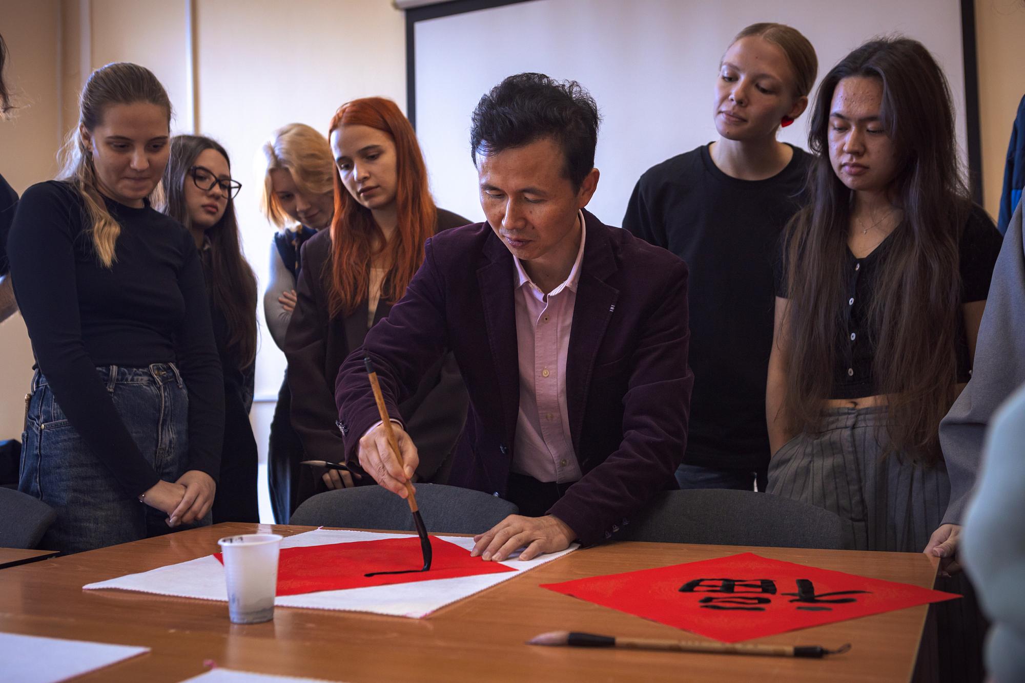 С культурой своей страны Цзян Хуншэн познакомил и будущих архитекторов. Художник предложил студентам написать иероглифы из лиричного стихотворения о девушках. Показывая, как выдерживать строгий порядок черт, мастер говорил о символизме искусства китайского письма.
