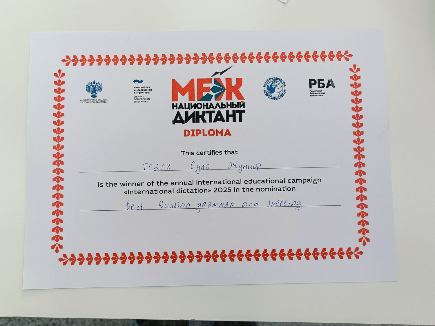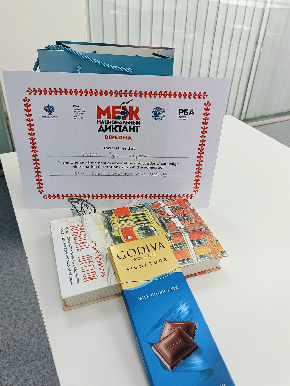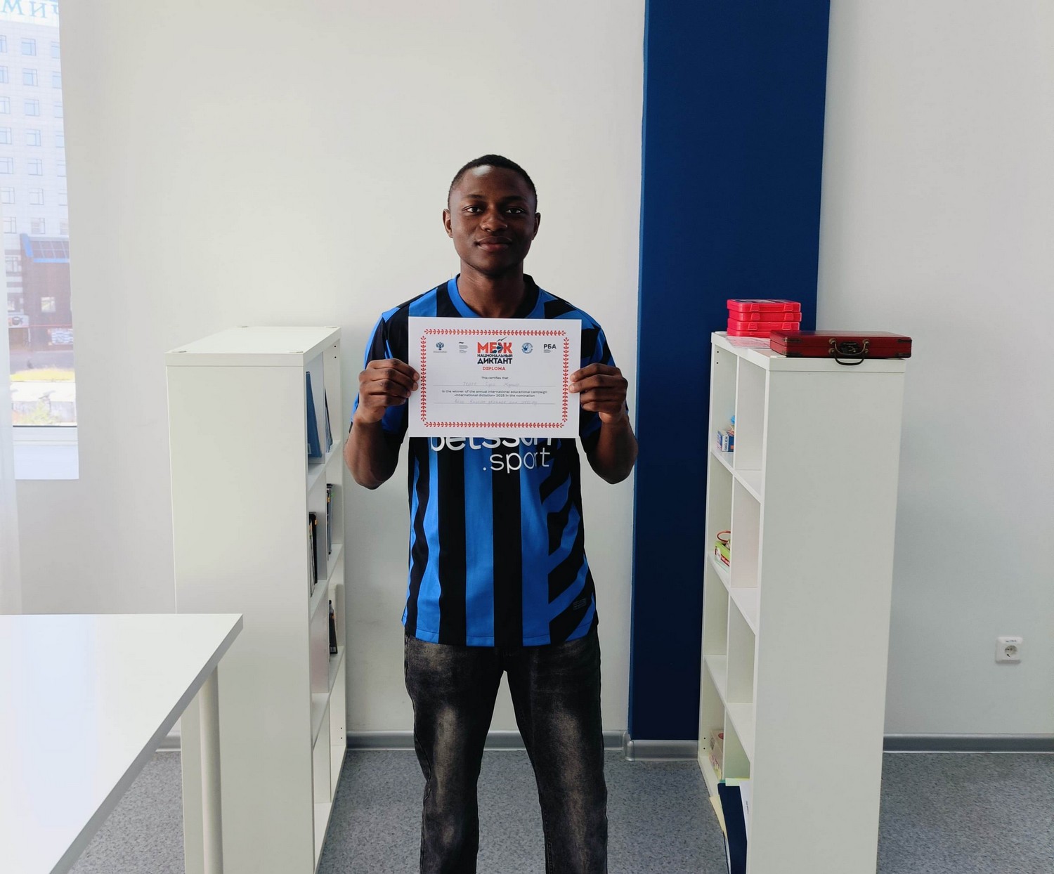 Напомним, 19 сентября группа выпускников Подготовительного отделения Департамента лингводидактики русского языка БИ БРИКС приняла участие в Международной просветительской акции «Межнациональный диктант», организованной Библиотекой иностранной литературы г. Москвы. Суна Жуниор стал победителем в номинации «Best Russian grammar and spelling» (Лучшая русская грамматика и орфография).