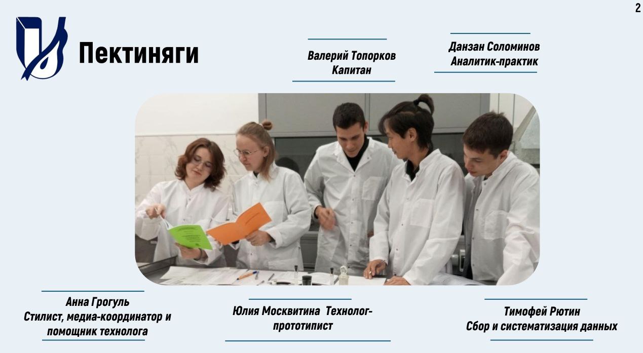 Второе место досталось команде ИРНИТУ «Пектиняги», предложившей практически безотходную переработку выжимок плодово-ягодного сырья. В результате авторы получили экстракт пектина, порошок из плодов и ягод. На основе данных компонентов они разработали и представили для оценки экспертной комиссии рецептуру злакового батончика ("гранолы"). Проект курирует доцент Алёна Грищенко.